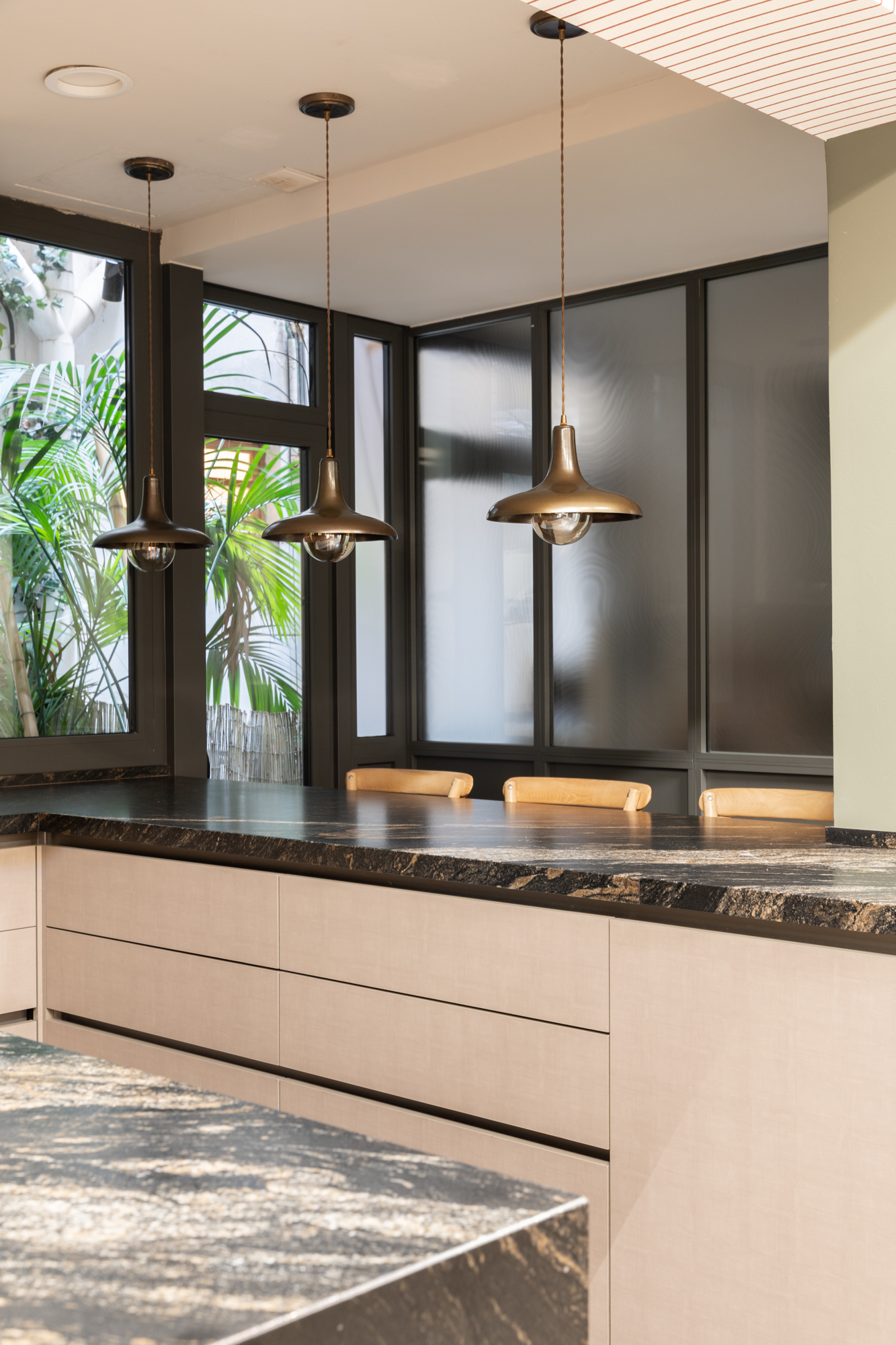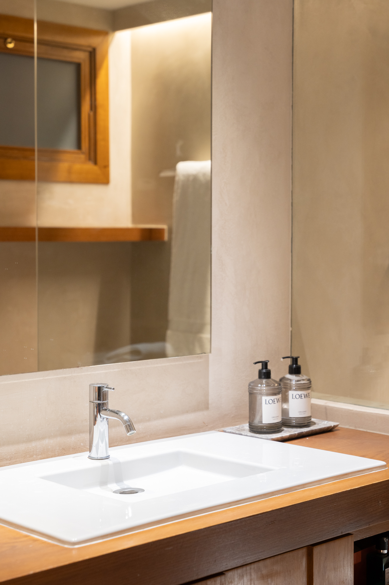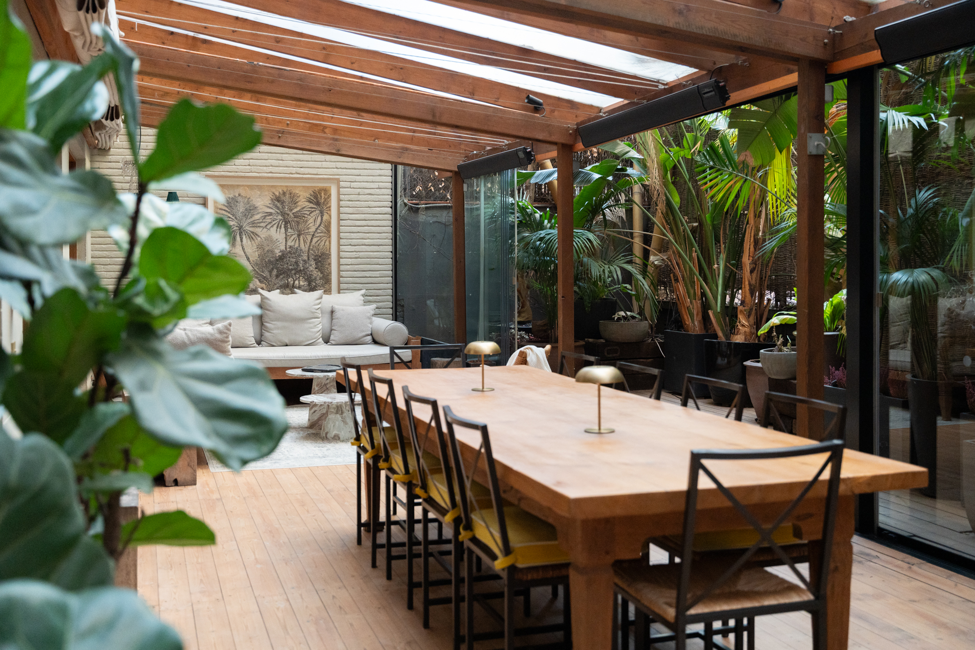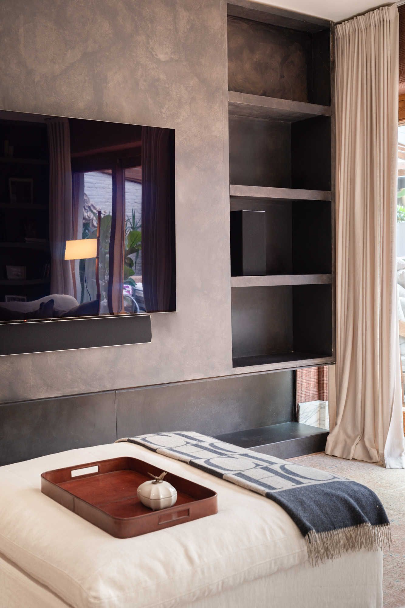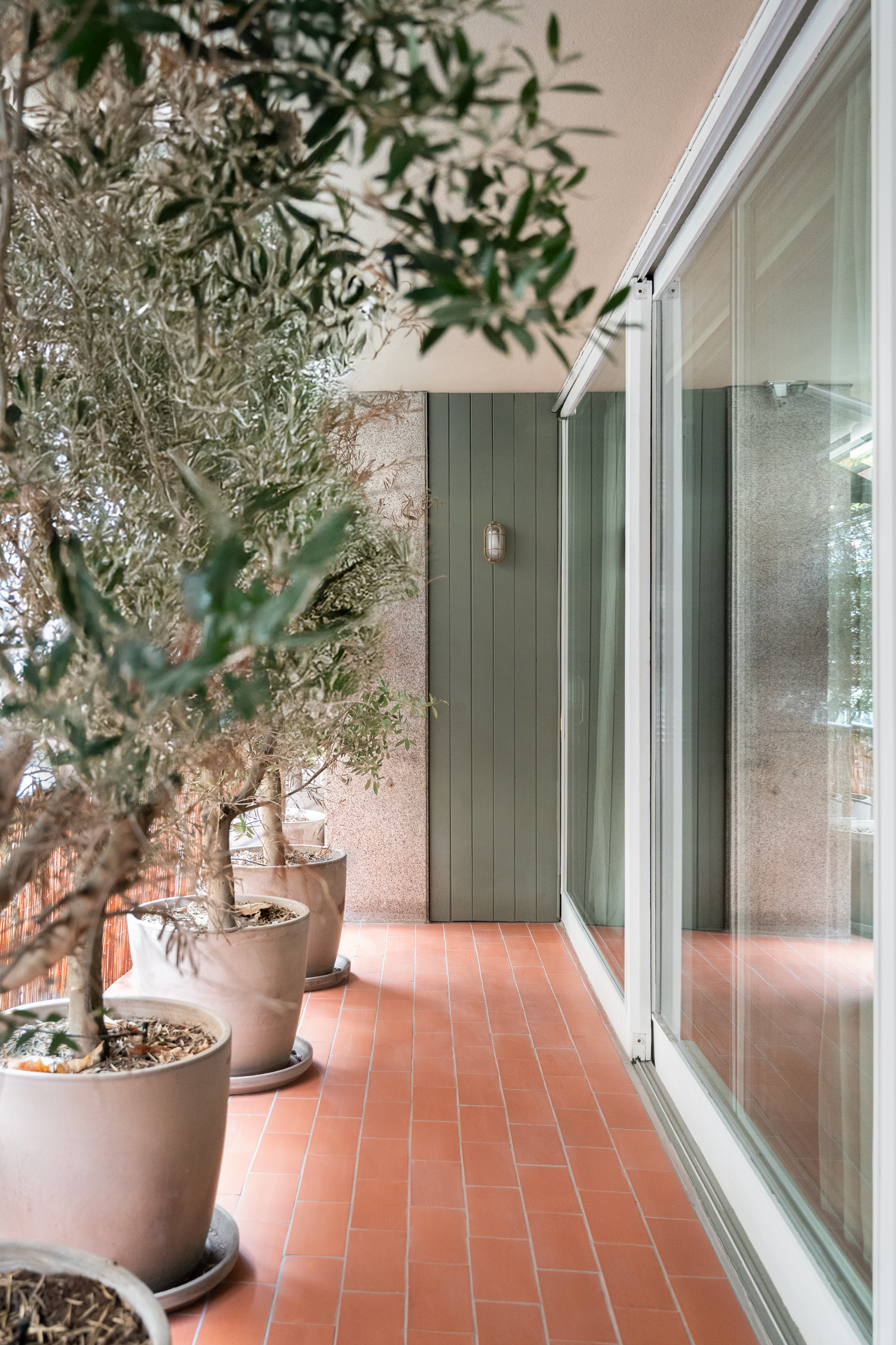 En generös entréhall separerar dagdelen, nattdelen och serviceutrymmena. Vardagsrummet/matsalen är arrangerad i tre distinkta utrymmen, kompletterad av en väggmålning av en känd konstnär, med stora fönster som vetter mot en terrass i söderläge. För mig har detta utomhusutrymme en riktig baliskänsla – något som tar mig tillbaka till mina många resor dit när jag bodde i Jakarta. Bredvid vardagsrummet finns ett rymligt kontor som kan omvandlas till ett extra sovrum med eget badrum.