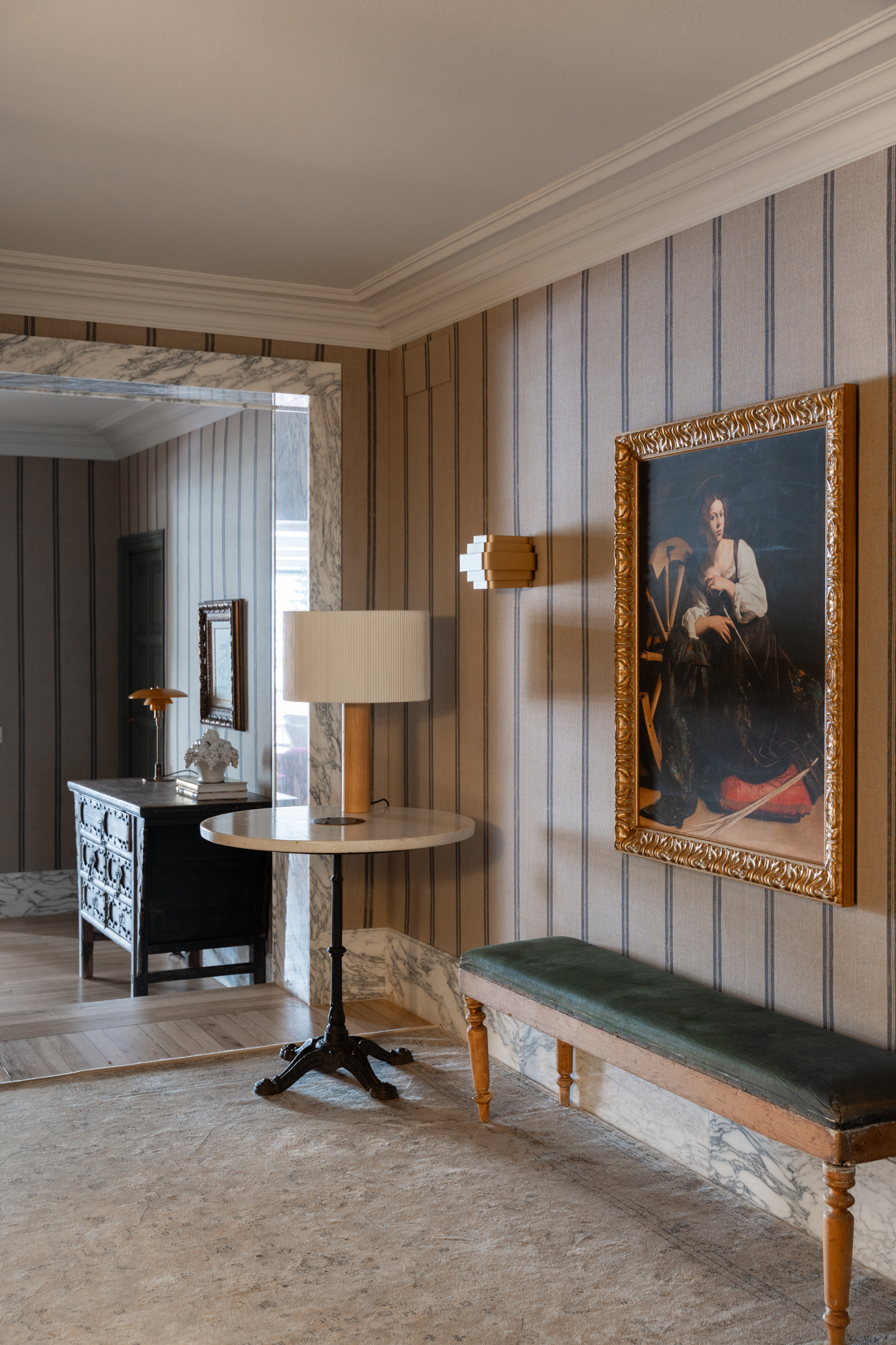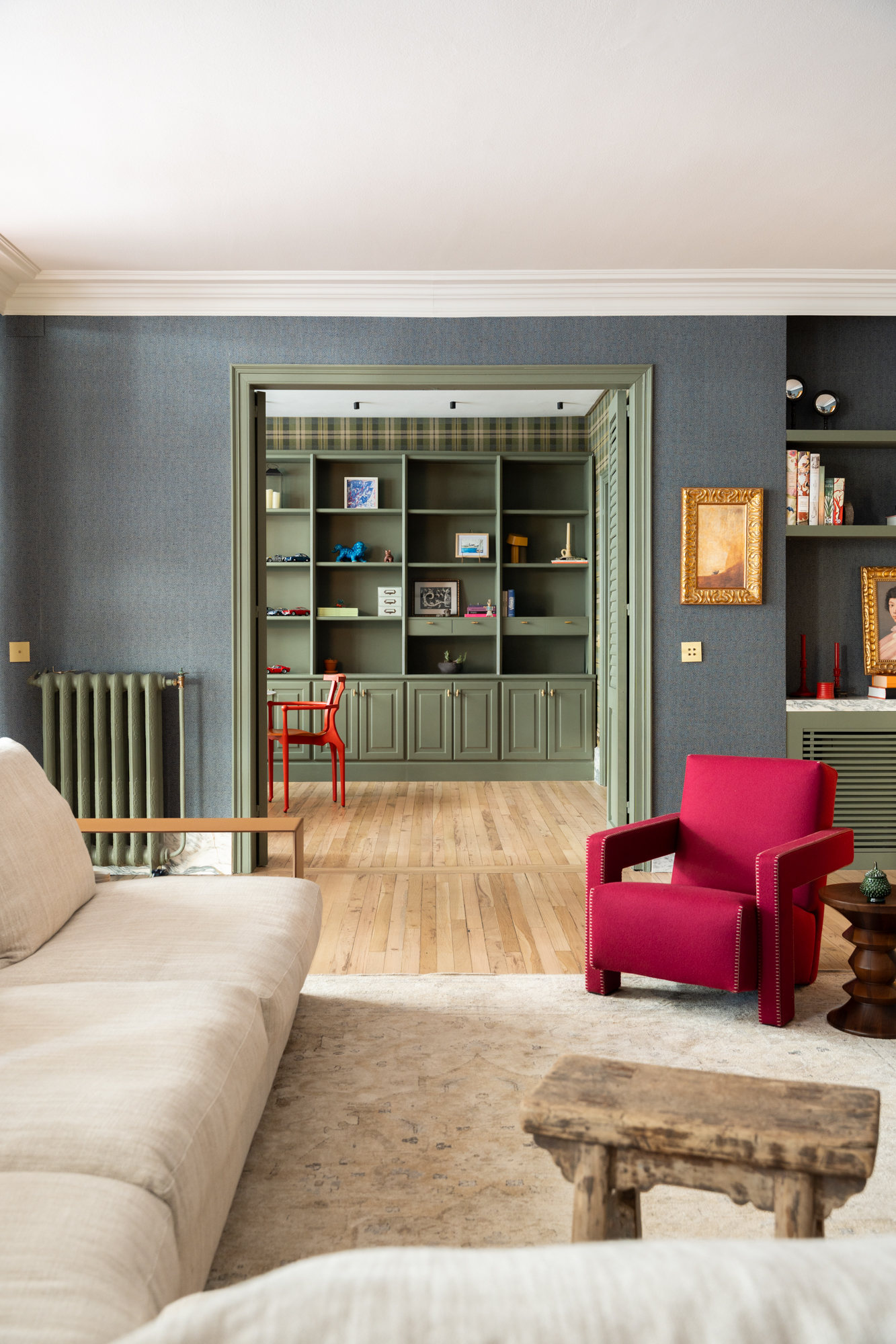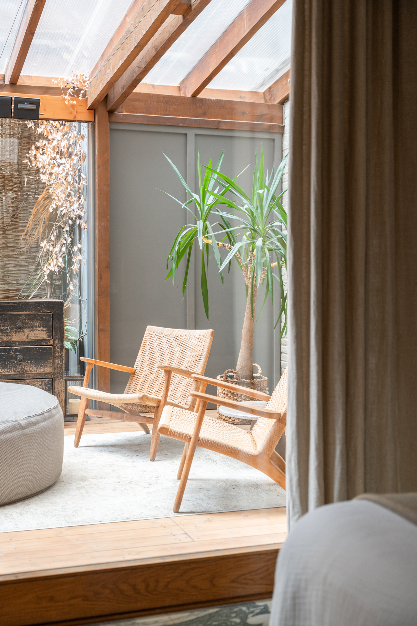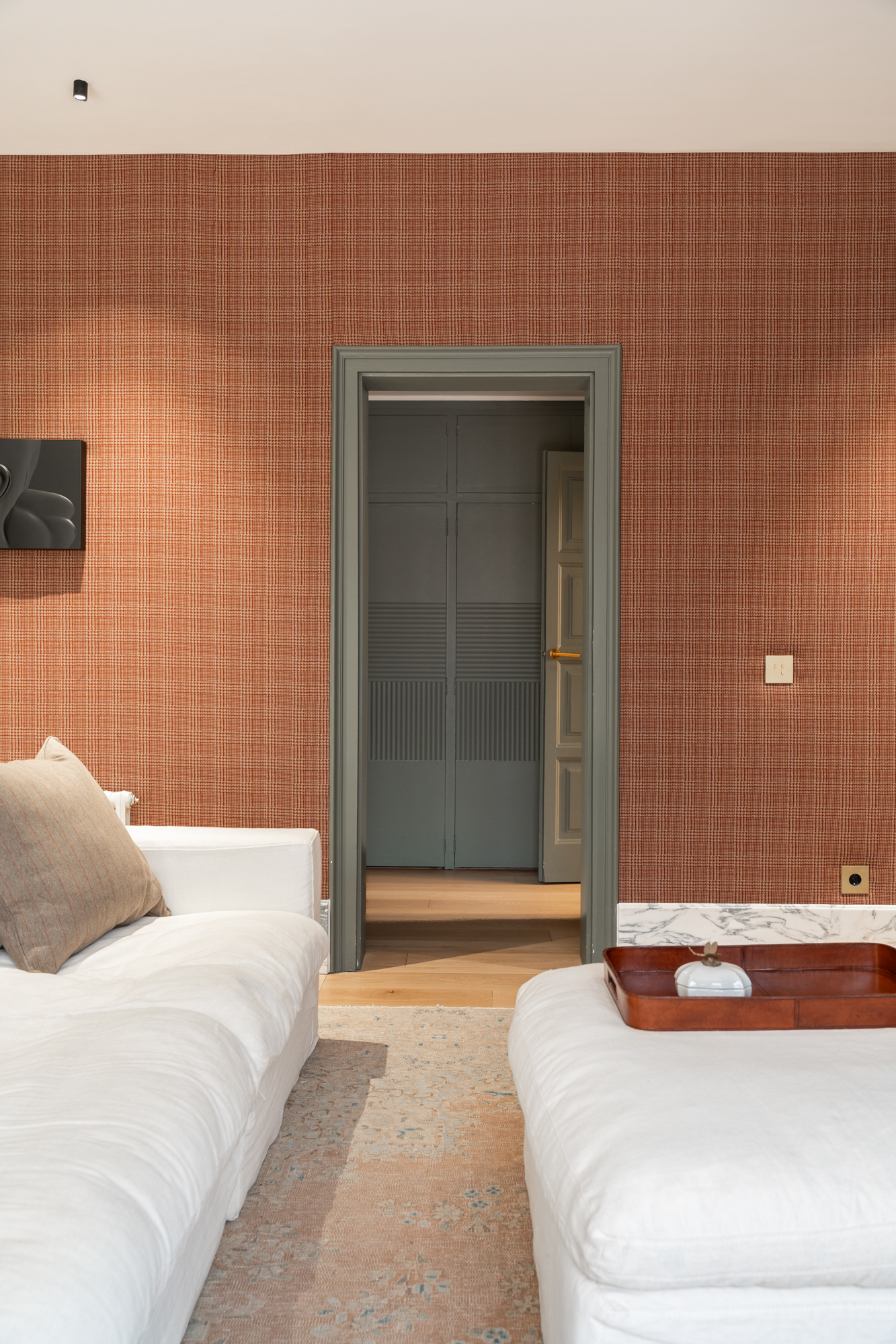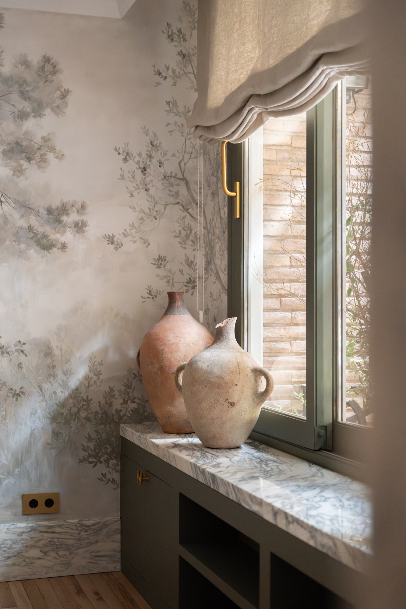 En generös entréhall separerar dagdelen, nattdelen och serviceutrymmena. Vardagsrummet/matsalen är arrangerad i tre distinkta utrymmen, kompletterad av en väggmålning av en känd konstnär, med stora fönster som vetter mot en terrass i söderläge. För mig har detta utomhusutrymme en riktig baliskänsla – något som tar mig tillbaka till mina många resor dit när jag bodde i Jakarta. Bredvid vardagsrummet finns ett rymligt kontor som kan omvandlas till ett extra sovrum med eget badrum.