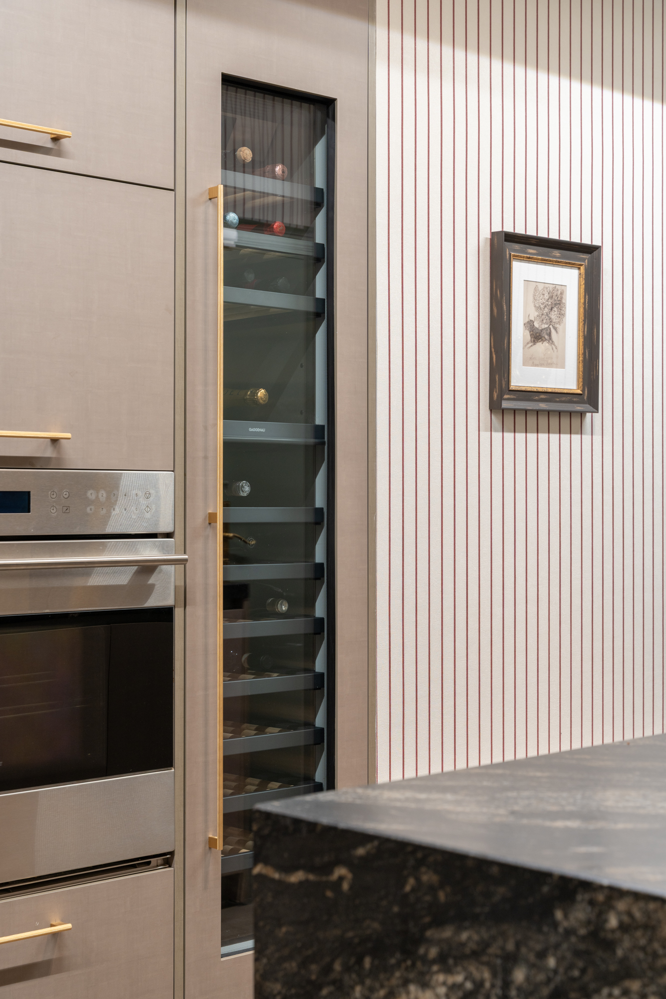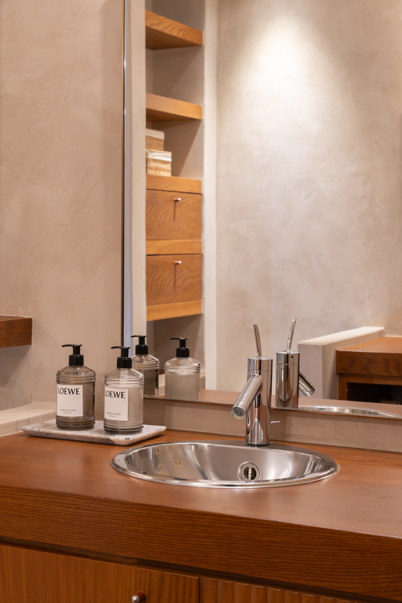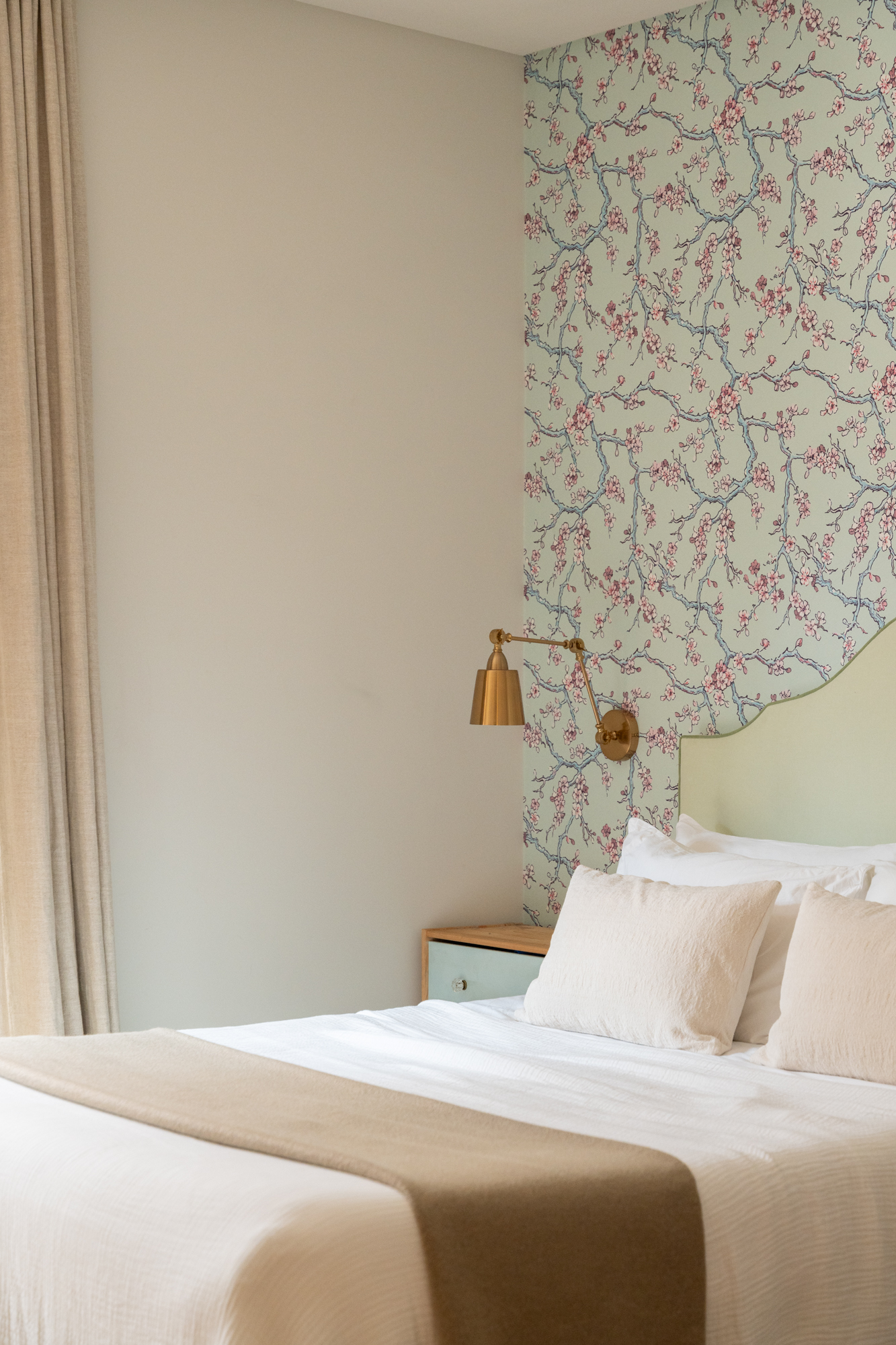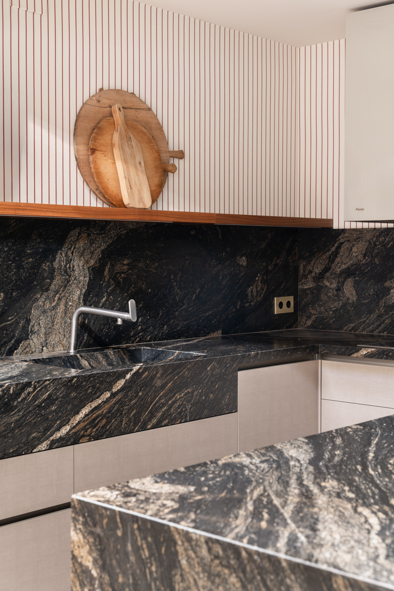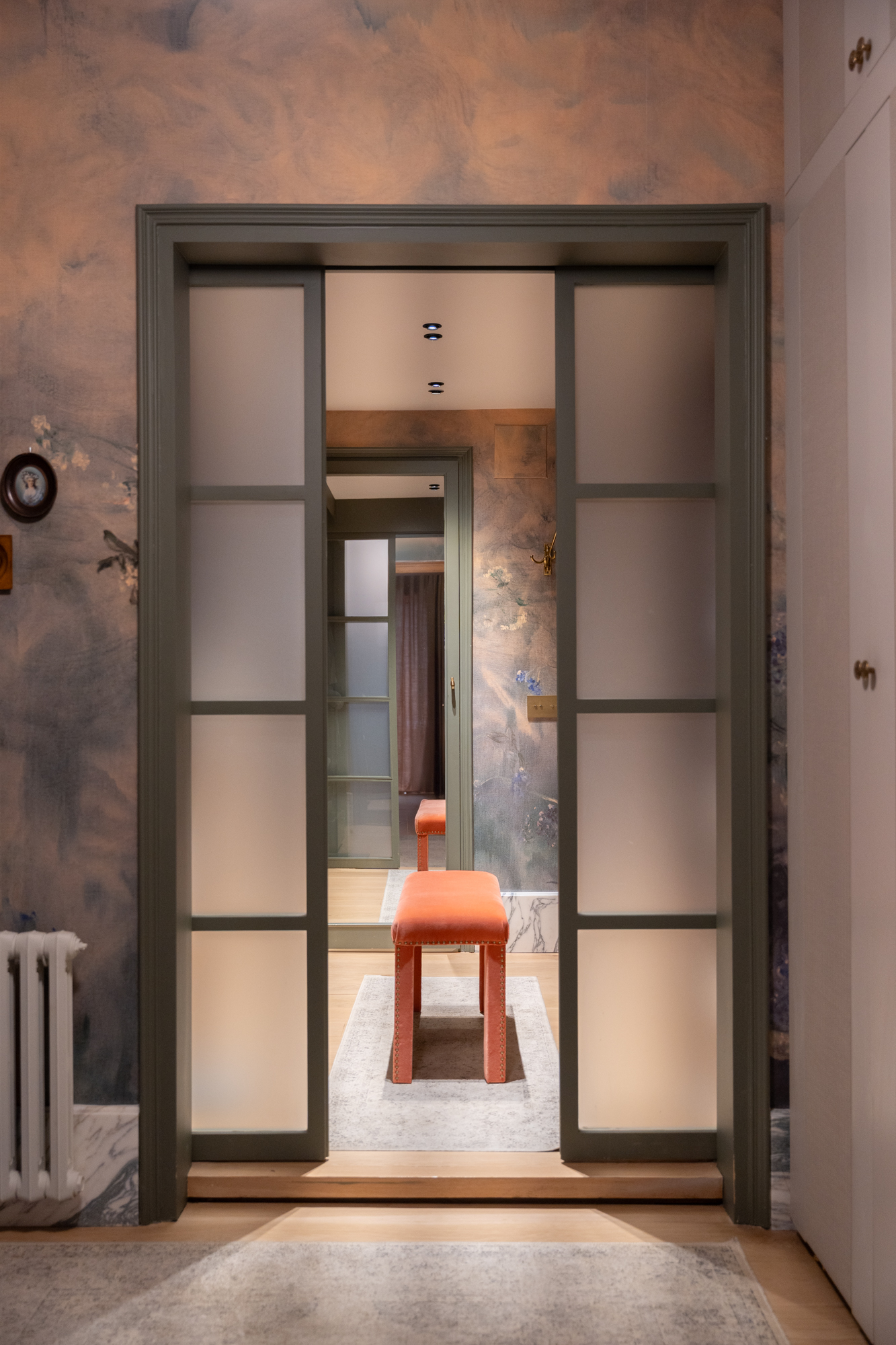 En generös entréhall separerar dagdelen, nattdelen och serviceutrymmena. Vardagsrummet/matsalen är arrangerad i tre distinkta utrymmen, kompletterad av en väggmålning av en känd konstnär, med stora fönster som vetter mot en terrass i söderläge. För mig har detta utomhusutrymme en riktig baliskänsla – något som tar mig tillbaka till mina många resor dit när jag bodde i Jakarta. Bredvid vardagsrummet finns ett rymligt kontor som kan omvandlas till ett extra sovrum med eget badrum.