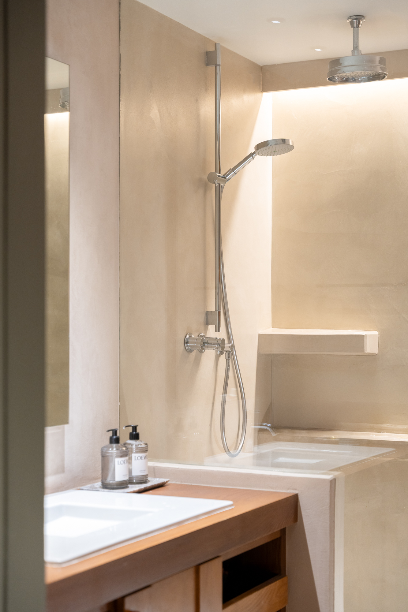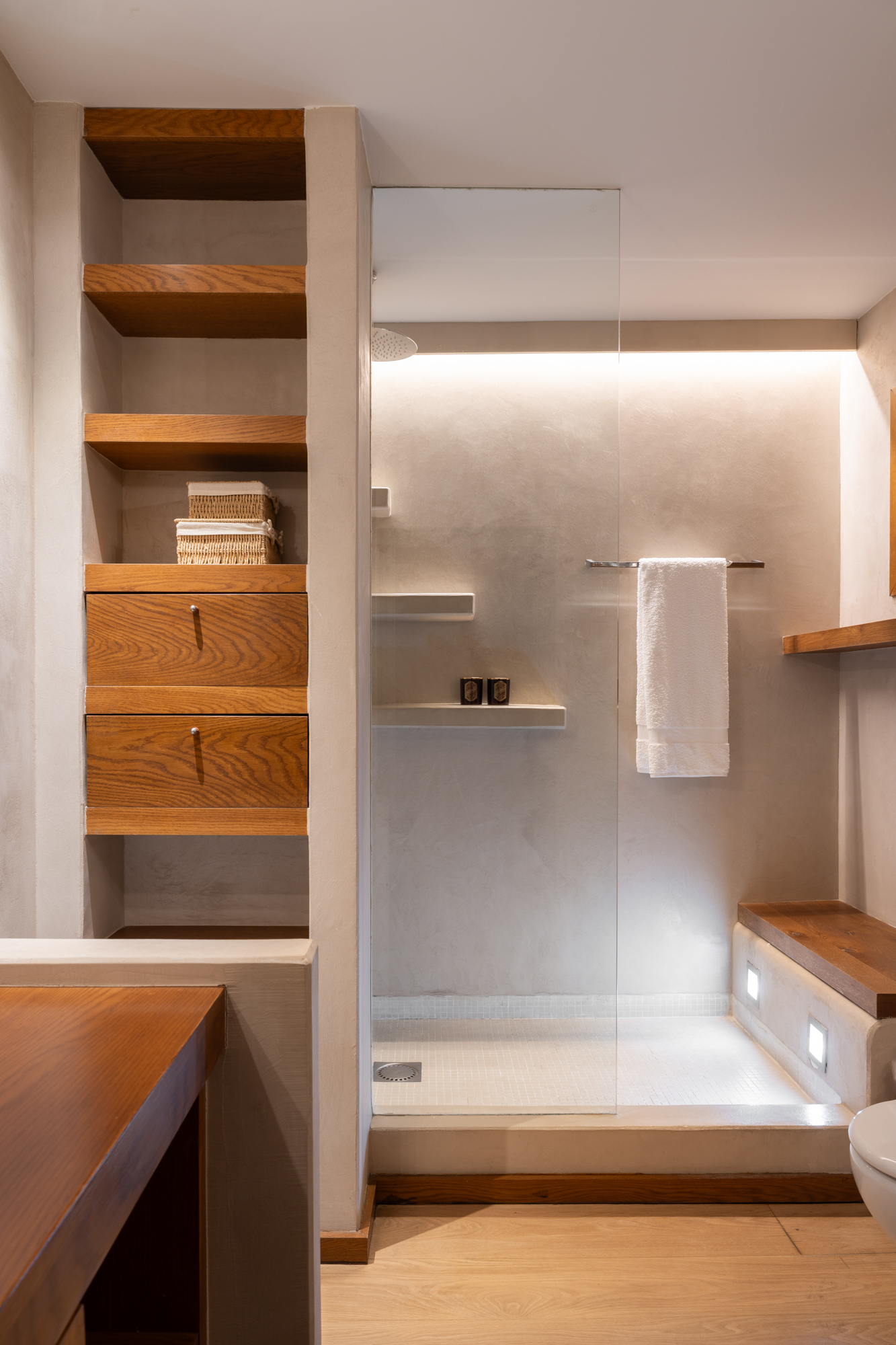 Nattdelen erbjuder en huvudsvit med öppen spis, klädkammare och eget badrum, plus ett mångsidigt rum som kan delas upp i två dubbelrum och ytterligare ett dubbelrum med ett komplett badrum. Alla rum har utgång mot en privat terrass på cirka 90 m².