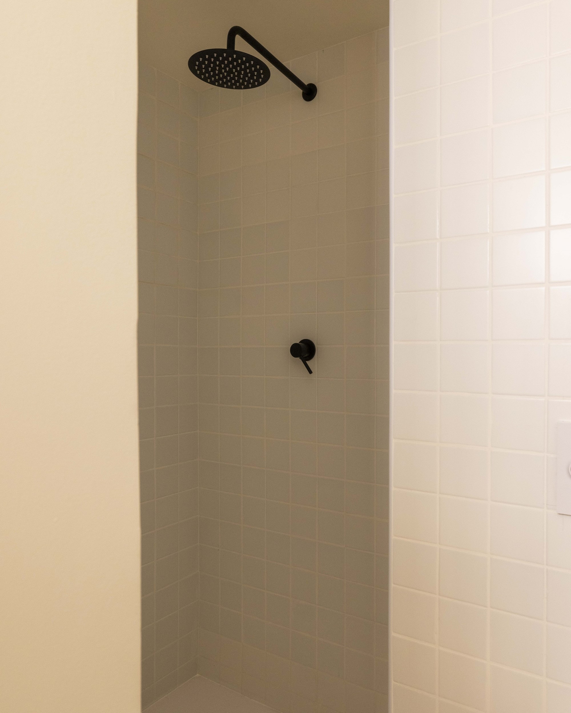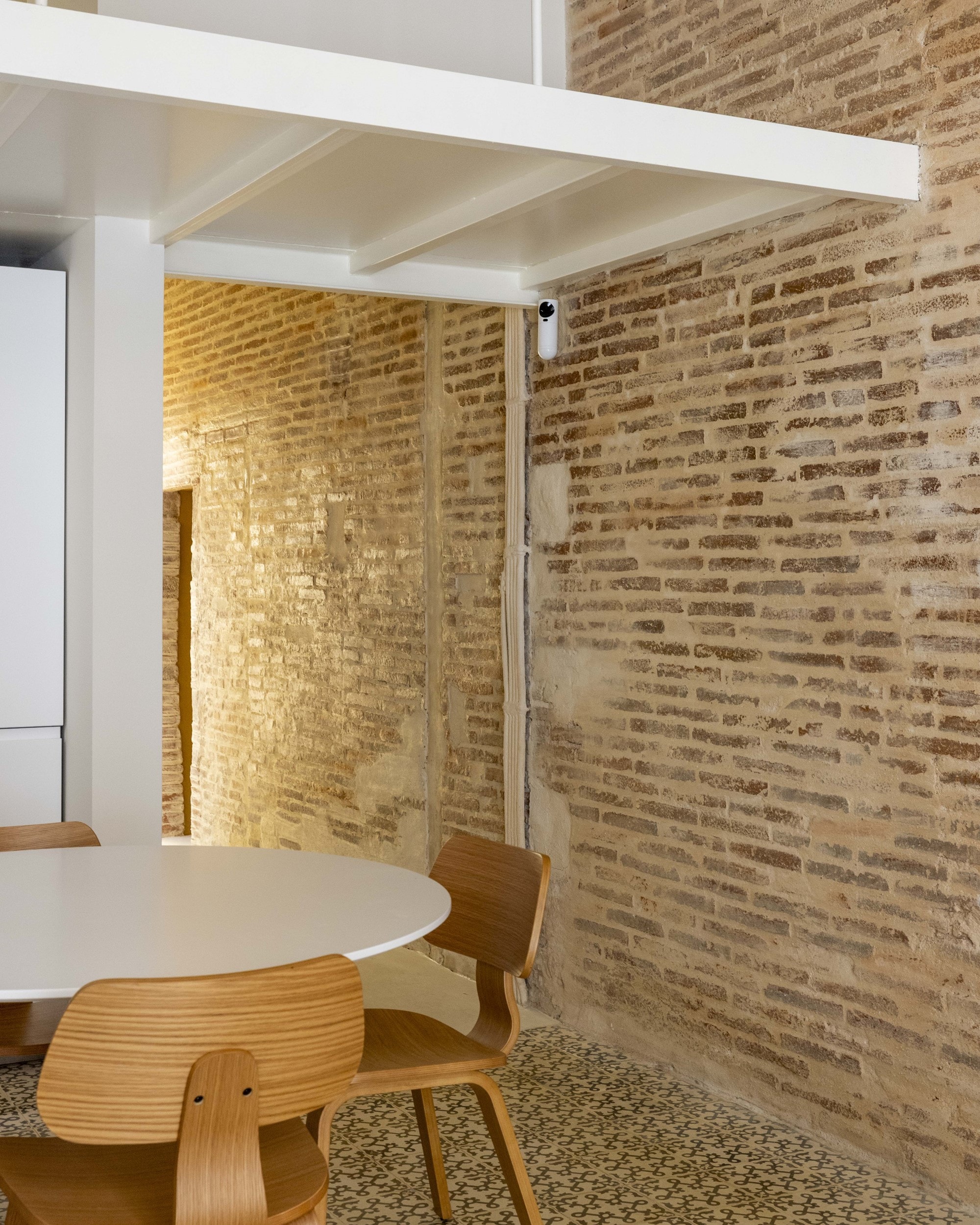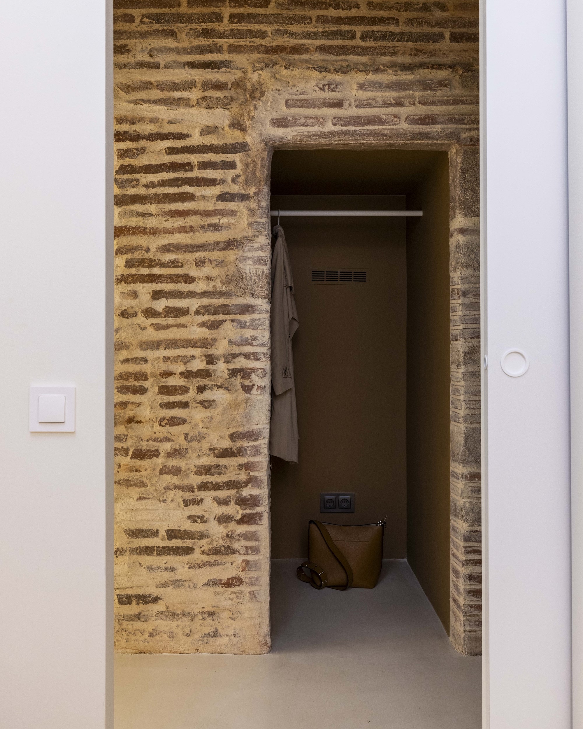 The property features two bedrooms, each with its own en-suite bathroom, as well as a separate wardrobe area and a convenient laundry space. The open kitchen—equipped with modern appliances—flows into a living area with high ceilings, original doors, windows, and flooring, and beautiful exposed brick walls that add warmth and authenticity.