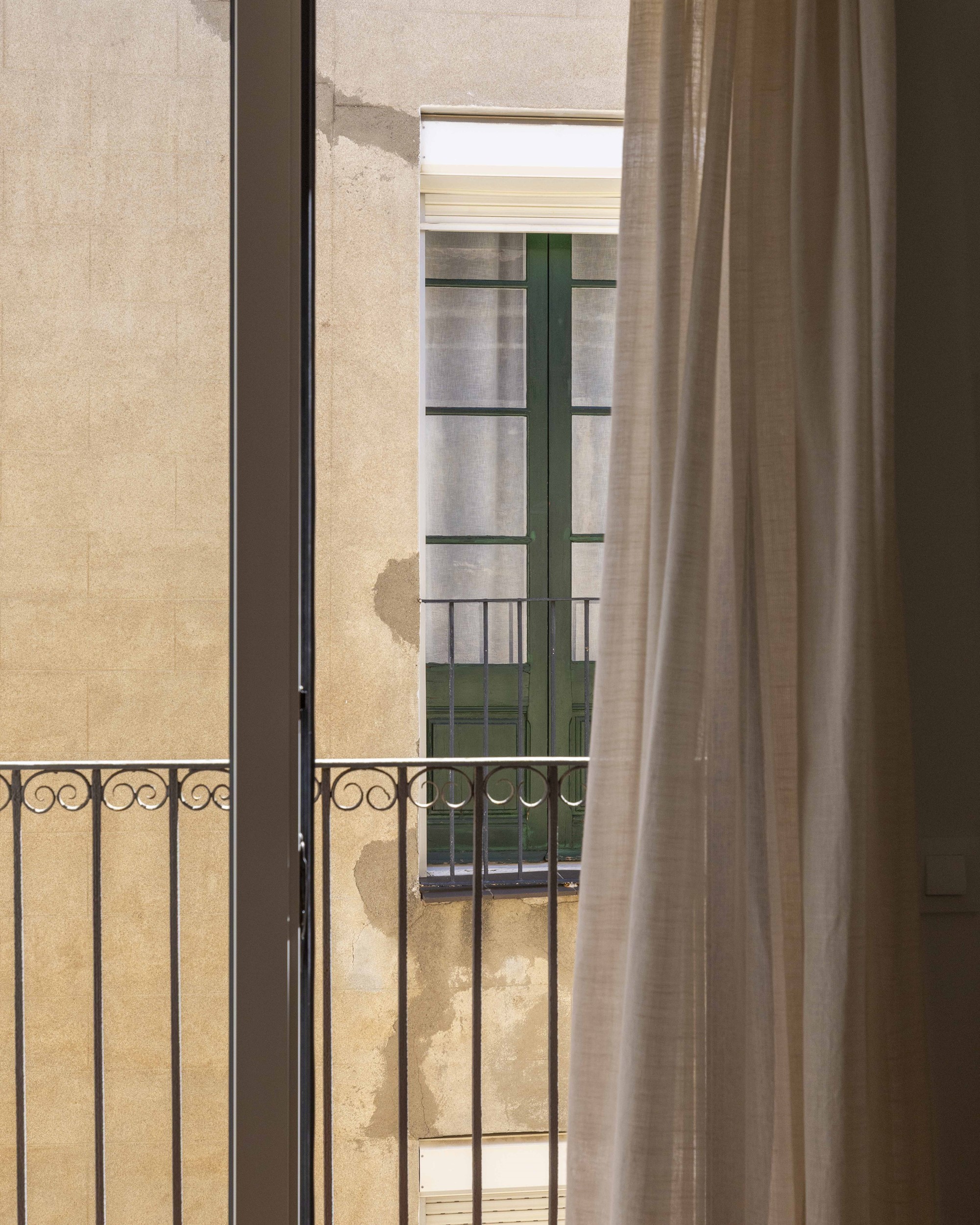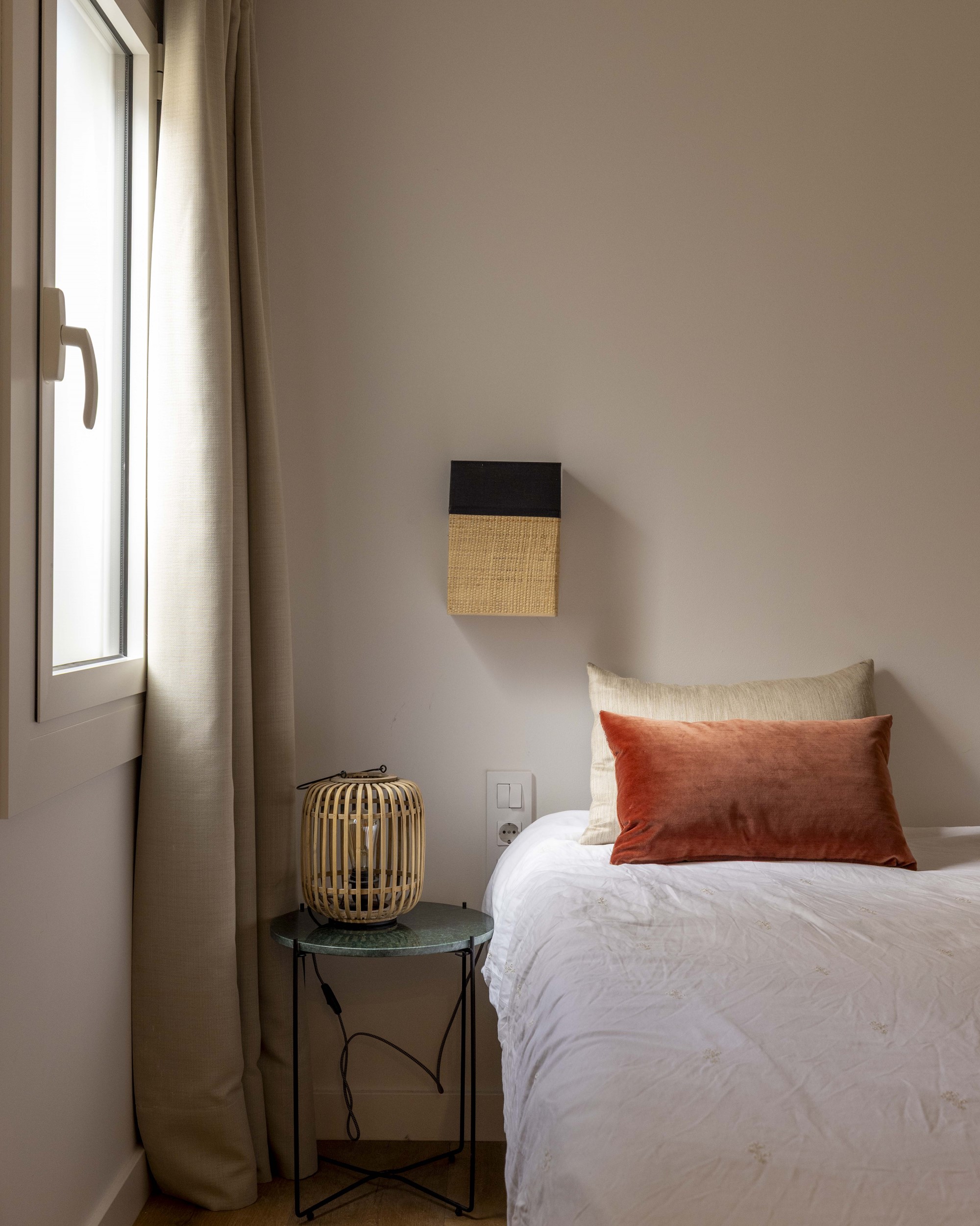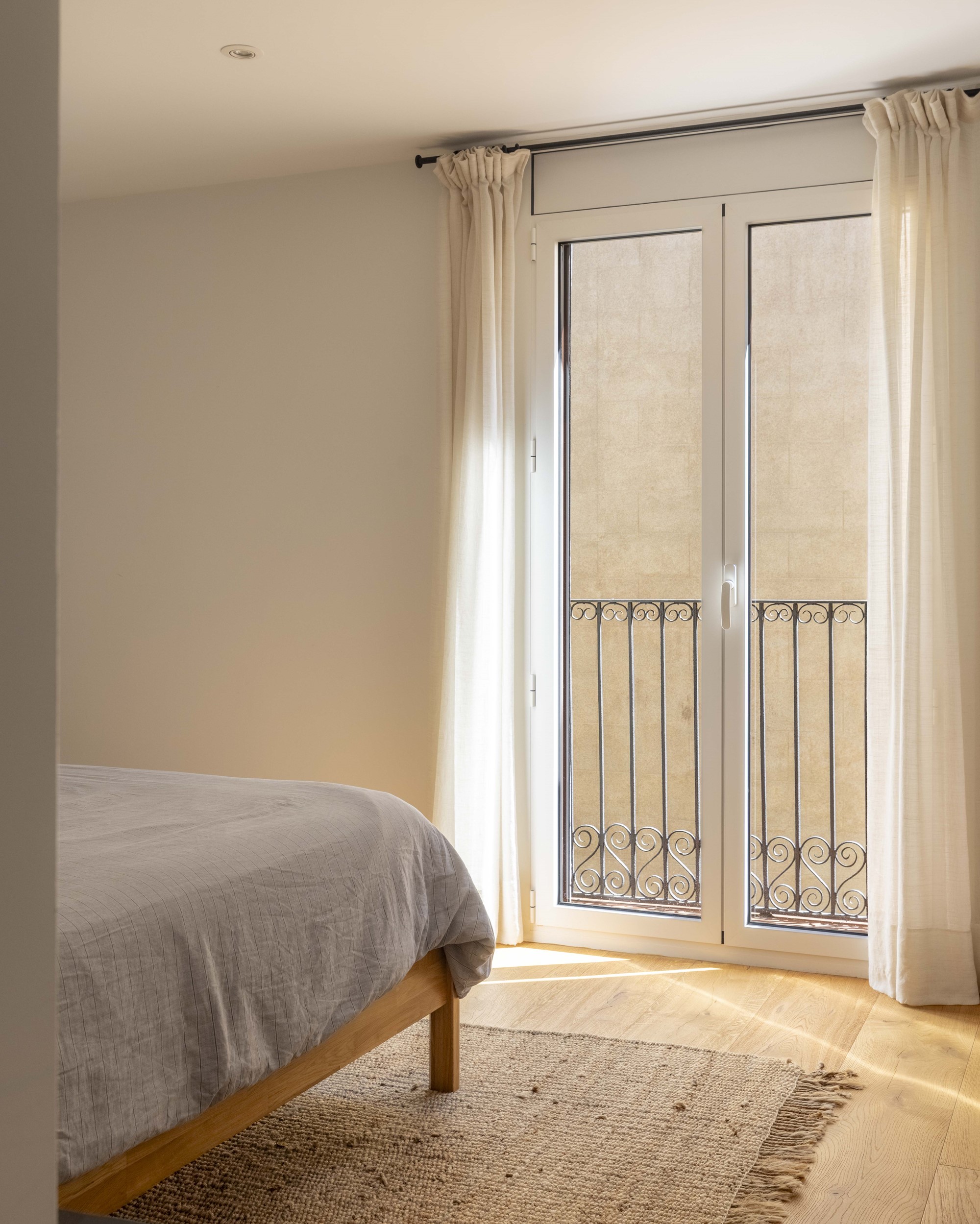 The night area comprises two generously sized suites, each with its own private bathroom, offering both comfort and privacy. The master suite also enjoys a charming balcony overlooking Carrer Rosic, with soft morning light.