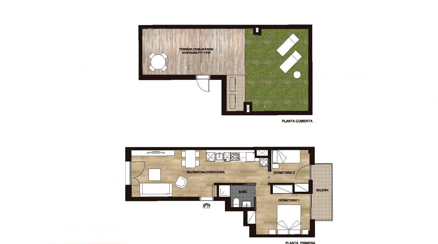 On the first floor, an apartment of 58m2 has been designed, with a double and a single room with direct access from both to a balcony, a full bathroom and an open kitchen.