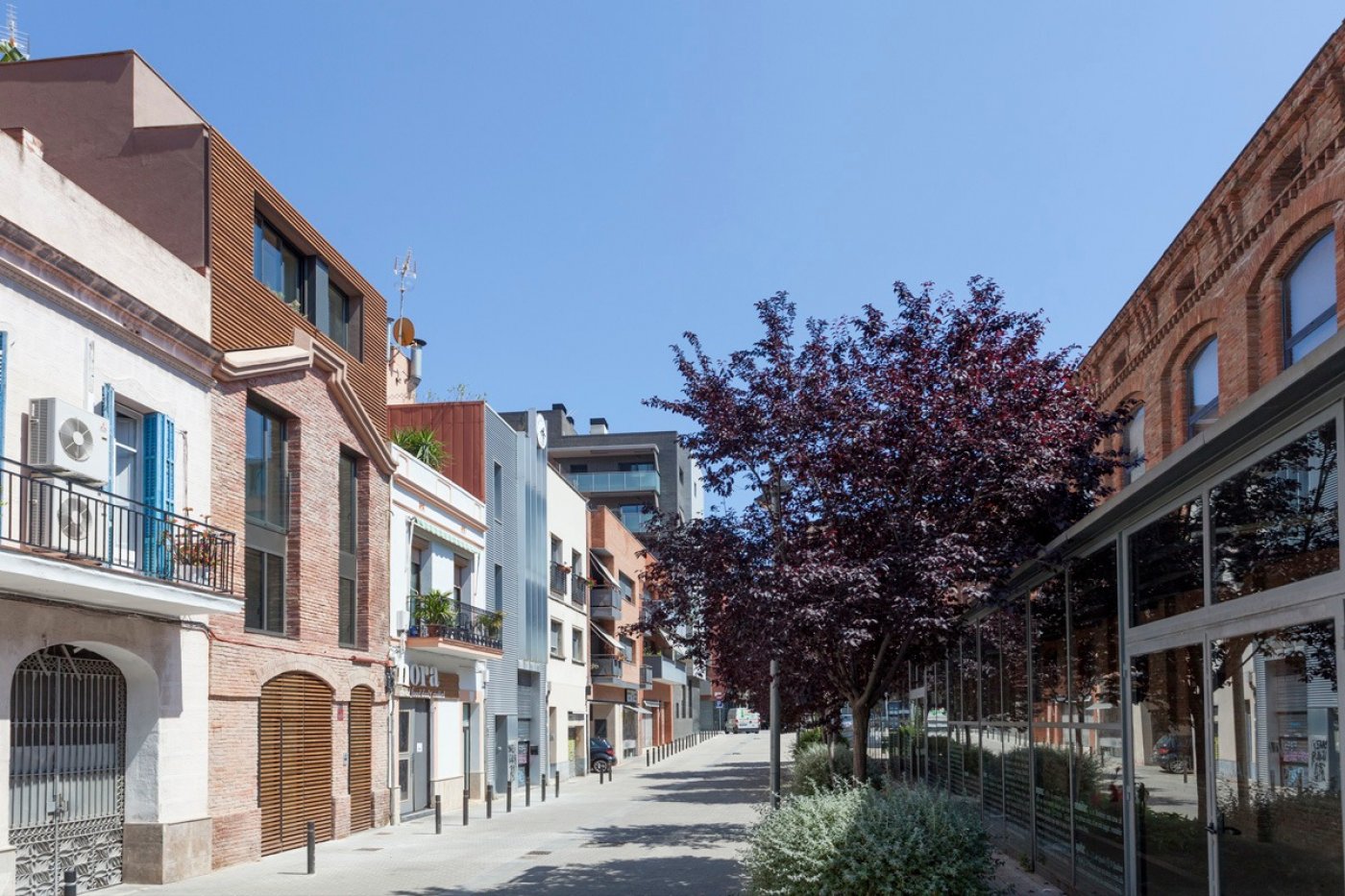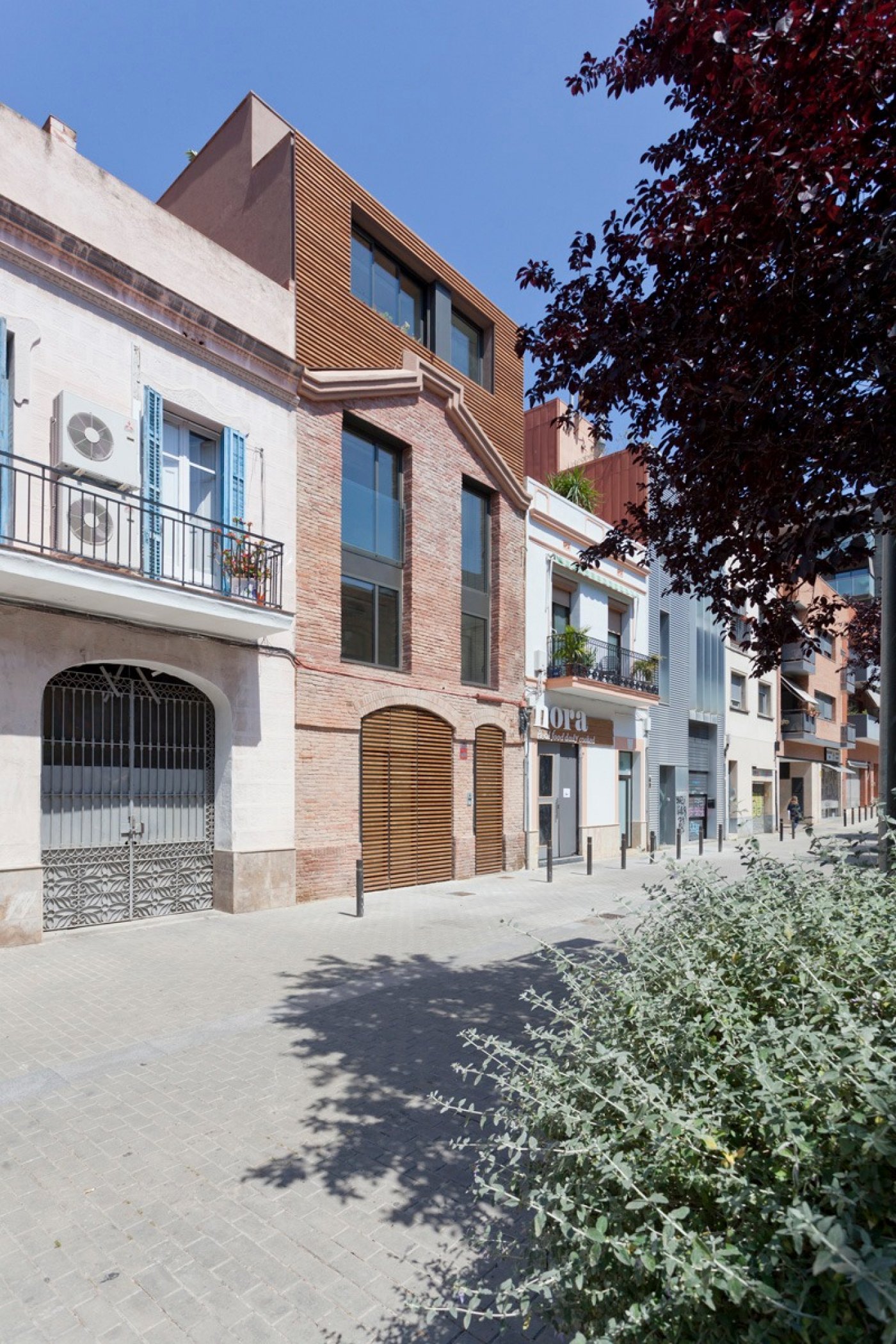 In a quiet pedestrian street in the Provençals del Poblenou neighborhood, in front of the old brick factory where the university is located today, is this beautiful building with an exposed brick, wood and glass facade that reminds us of the neighborhood's industrial past.