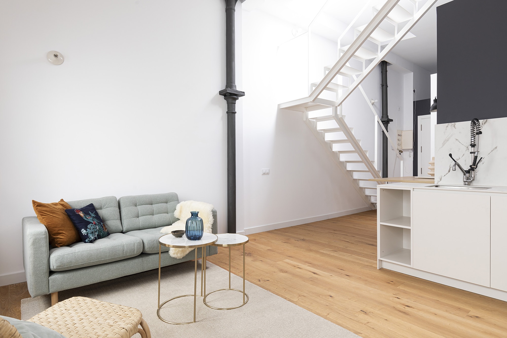 The penthouse consists of a living room, an open kitchen equipped with top brand home appliances and a double bedroom en suite with a bathroom. Walking up the stairs inside the apartment, you have access to a spectacular 42 m2 private terrace with panoramic views over the whole city and sun throughout the whole day! It is completely refurbished with luxury finishes, air conditioning and heating, wooden carpentry, natural parquet, which join the original elements such as high ceilings with wooden beams.