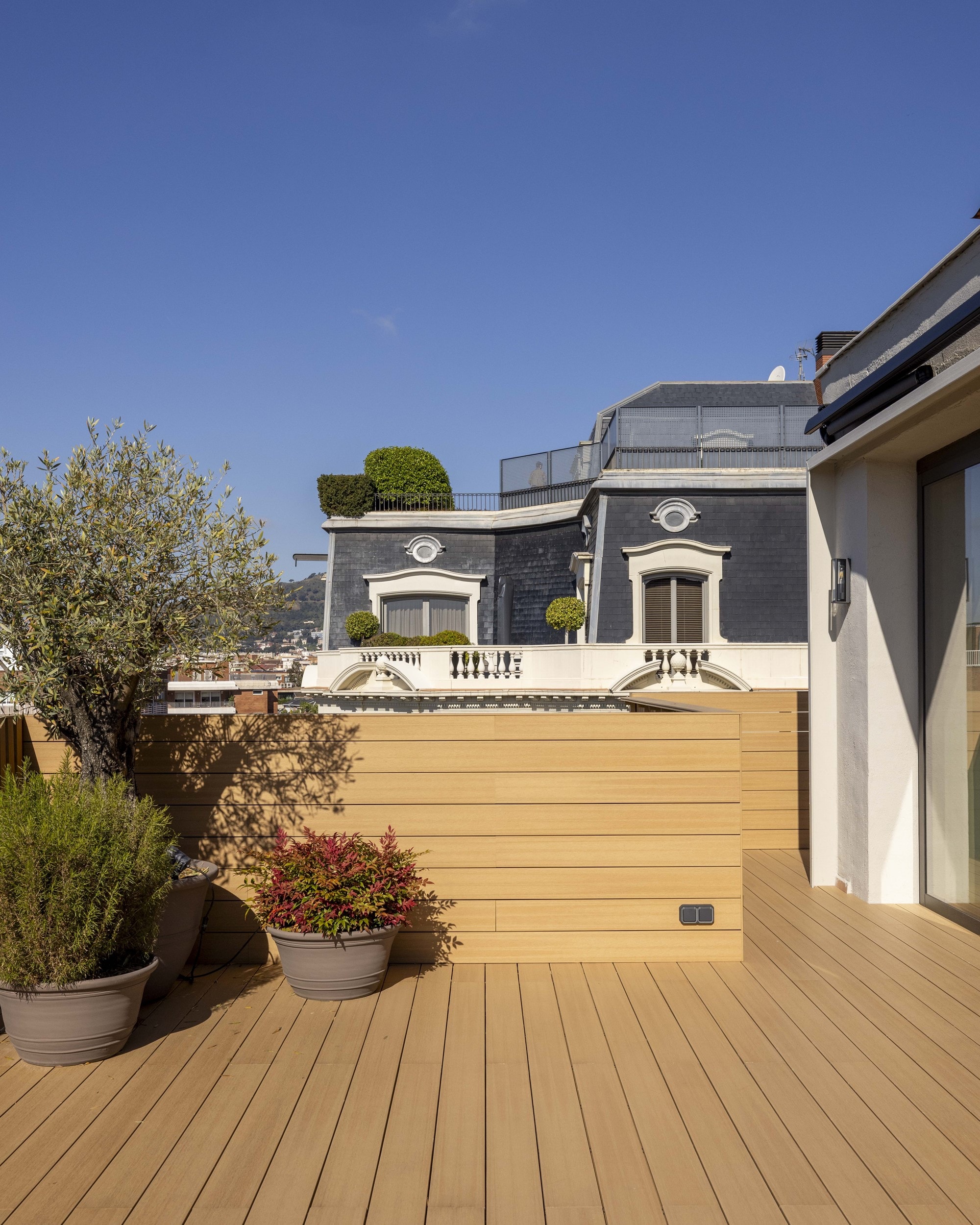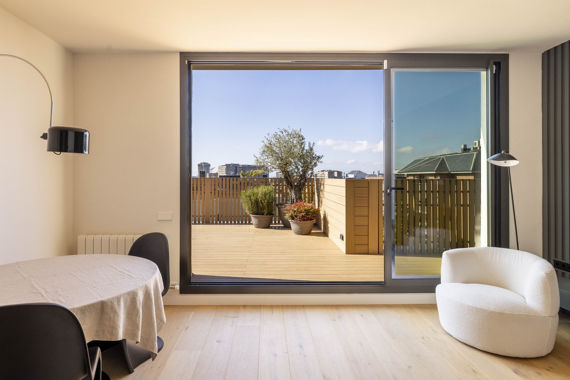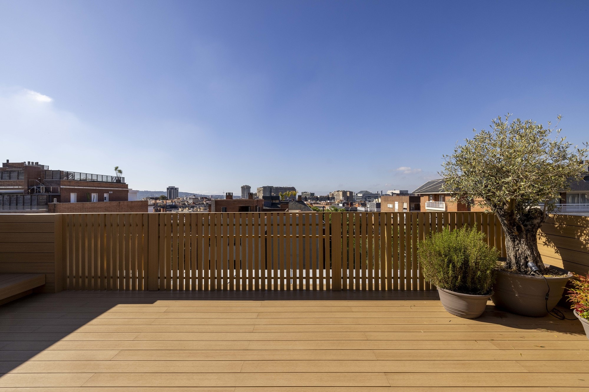 A standout feature is the 80 m² private terrace, which includes an outdoor kitchen and areas for dining and sunbathing. It has as well as an outdoor shower, storage space and a sunshade system that provides cover and comfort throughout the day. The terrace enjoys impressive views over Barcelona and is accessible directly from the main living area.