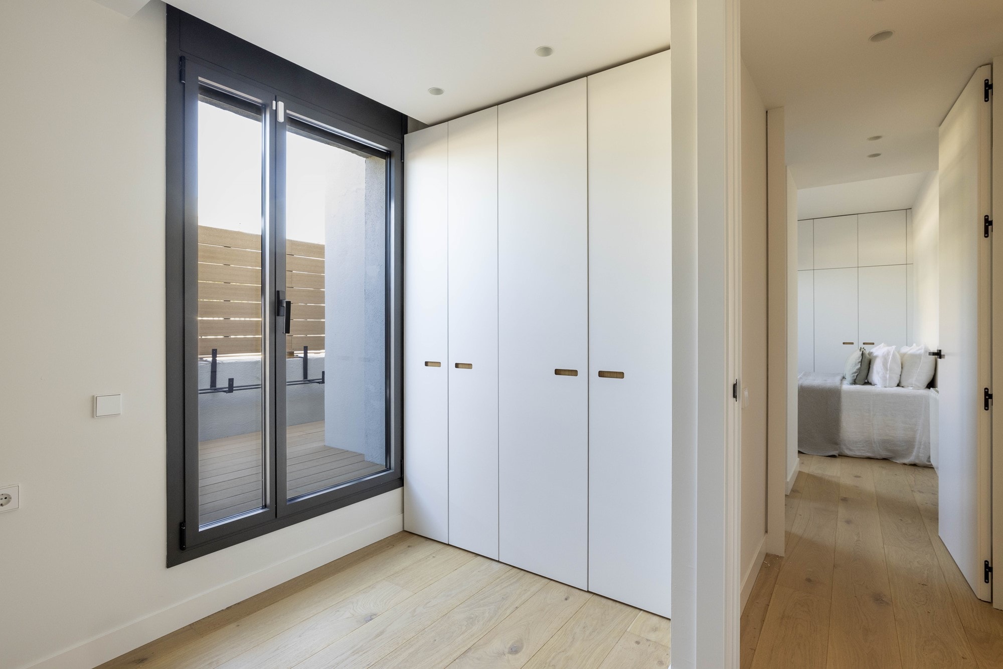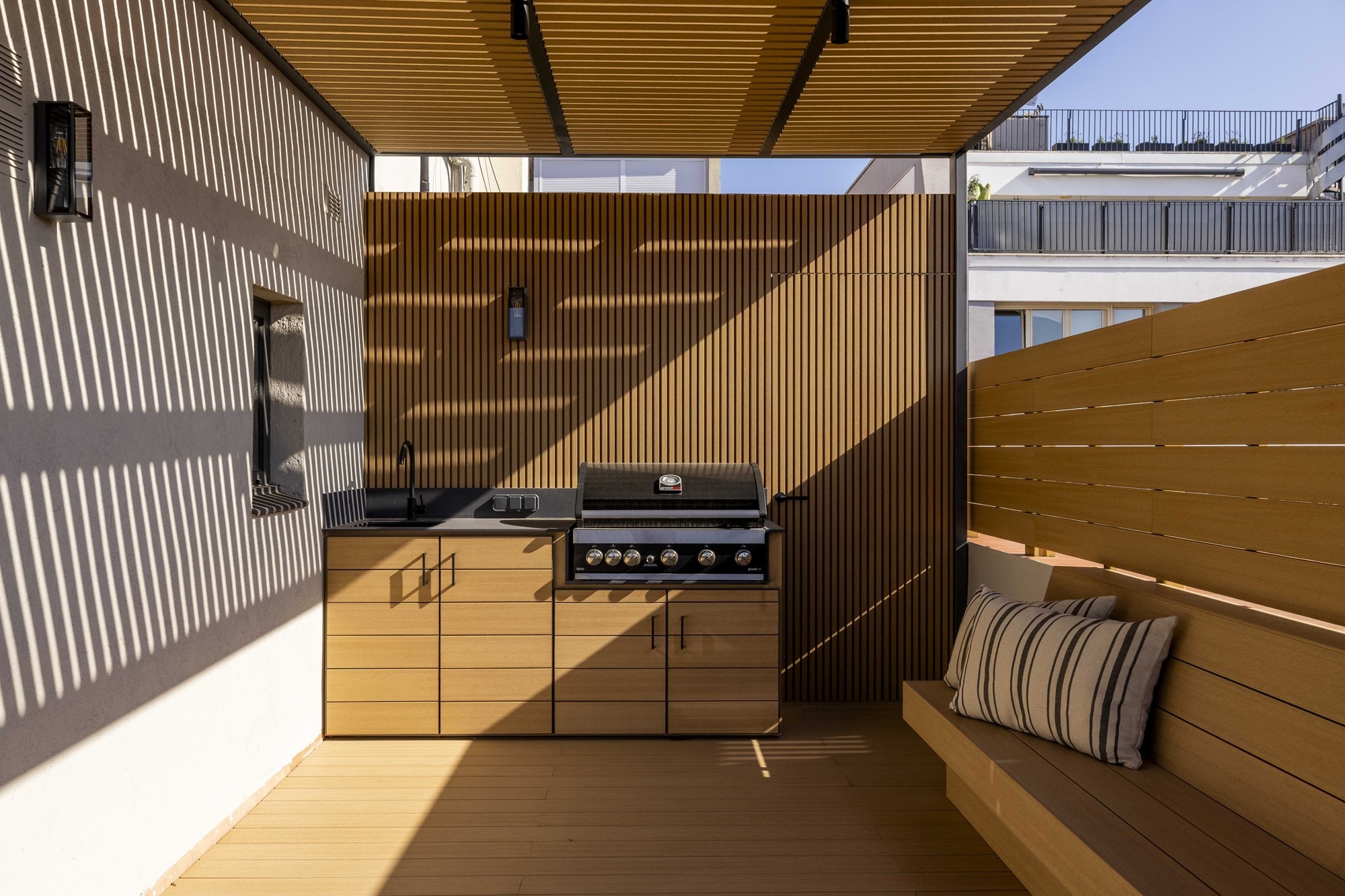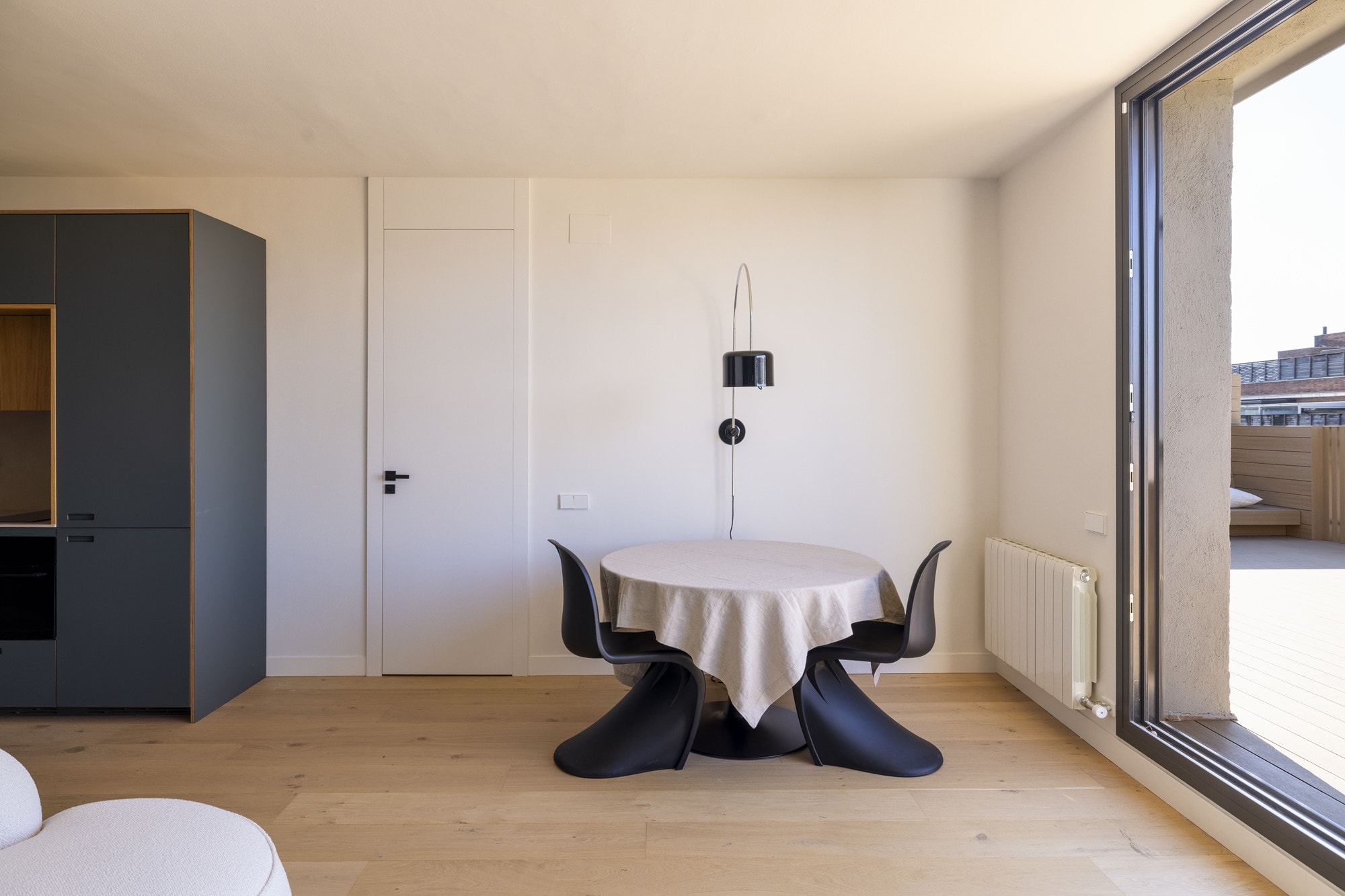 A standout feature is the 80 m² private terrace, which includes an outdoor kitchen and areas for dining and sunbathing. It has as well as an outdoor shower, storage space and a sunshade system that provides cover and comfort throughout the day. The terrace enjoys impressive views over Barcelona and is accessible directly from the main living area.
