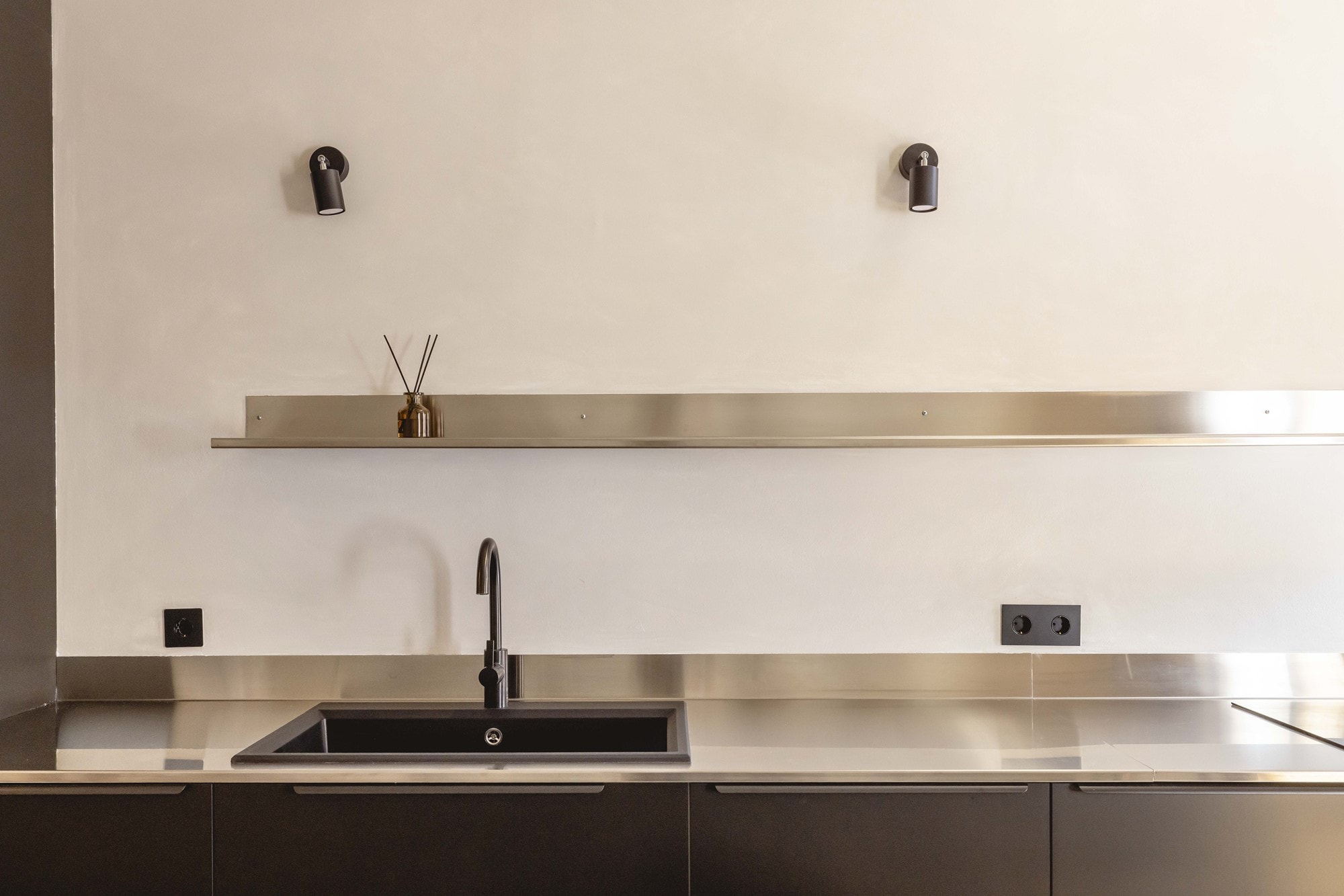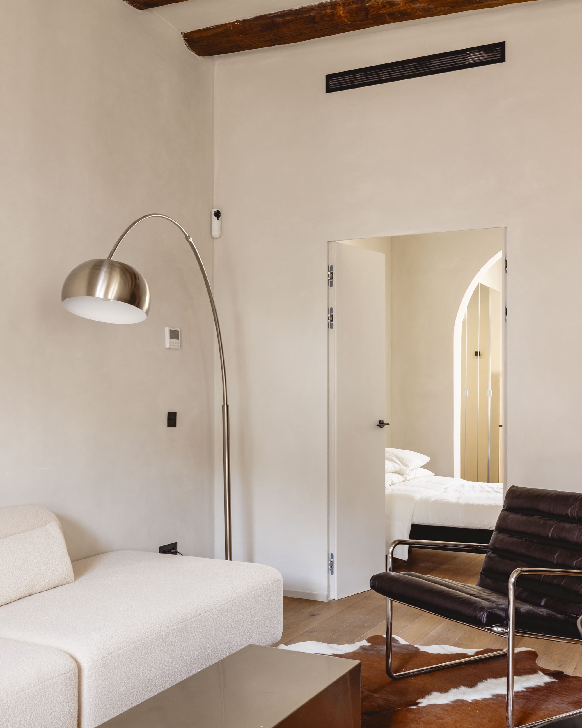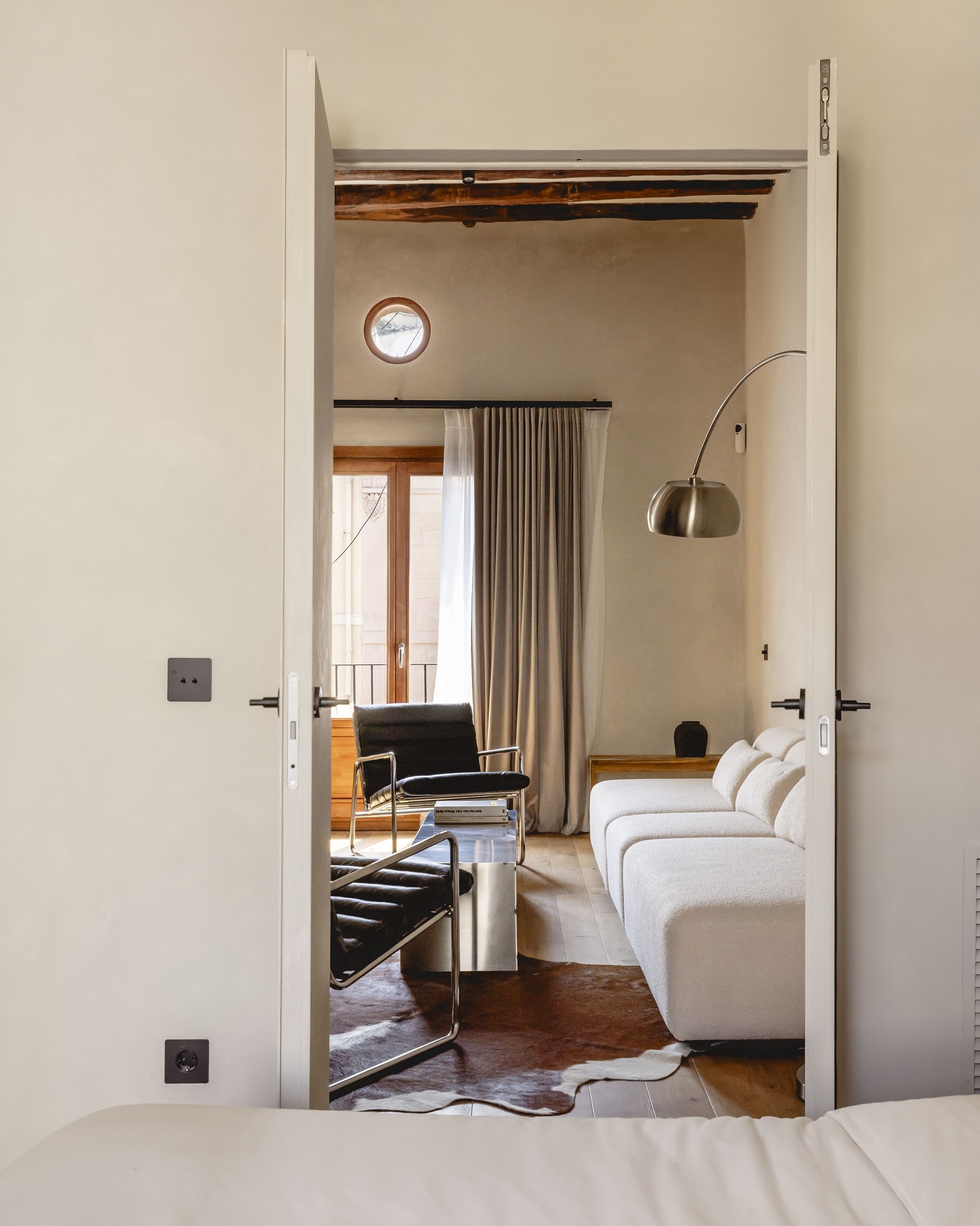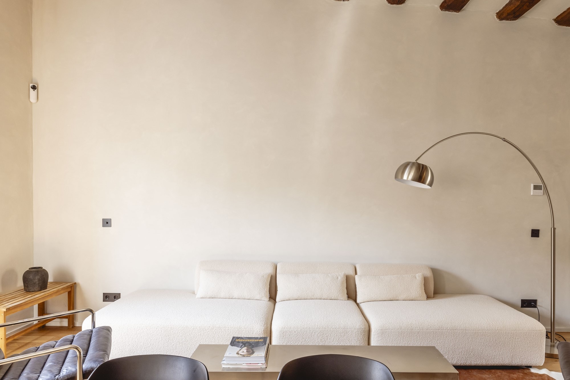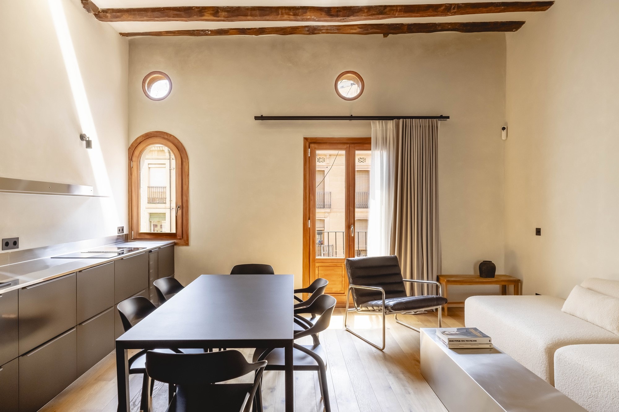 This recently renovated penthouse on Sant Pau Street, on the axis between Sant Antoni and Raval, is a unique gem. With impressive ceiling heights, the property is filled with natural light, creating a spacious and airy atmosphere.