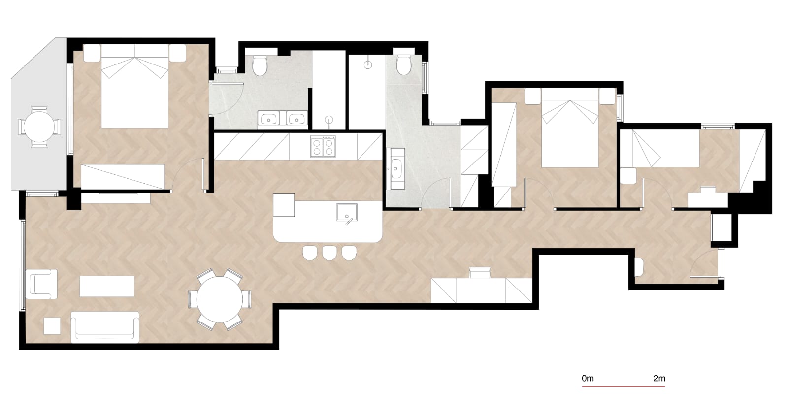 Skräddarsydda tvåglasfönster med tippfunktion ger ljus, isolering och tystnad, medan badrummen är utrustade med Grohe-termostatdusch och blandare av hög kvalitet. Fyra kabelanslutna internetpunkter gör lägenheten perfekt för gamers eller hemarbete.