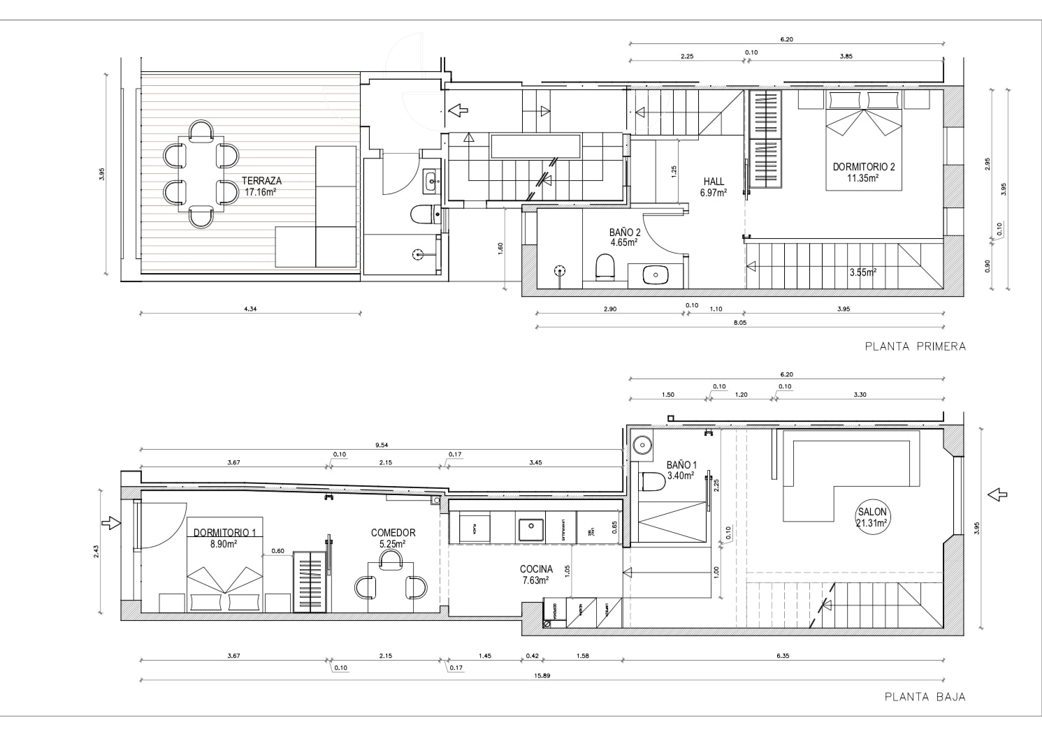 The duplex features a spacious and bright living-dining room with an equipped open-plan kitchen, creating a comfortable and open-plan space. It has two en-suite bedrooms, one on each floor.