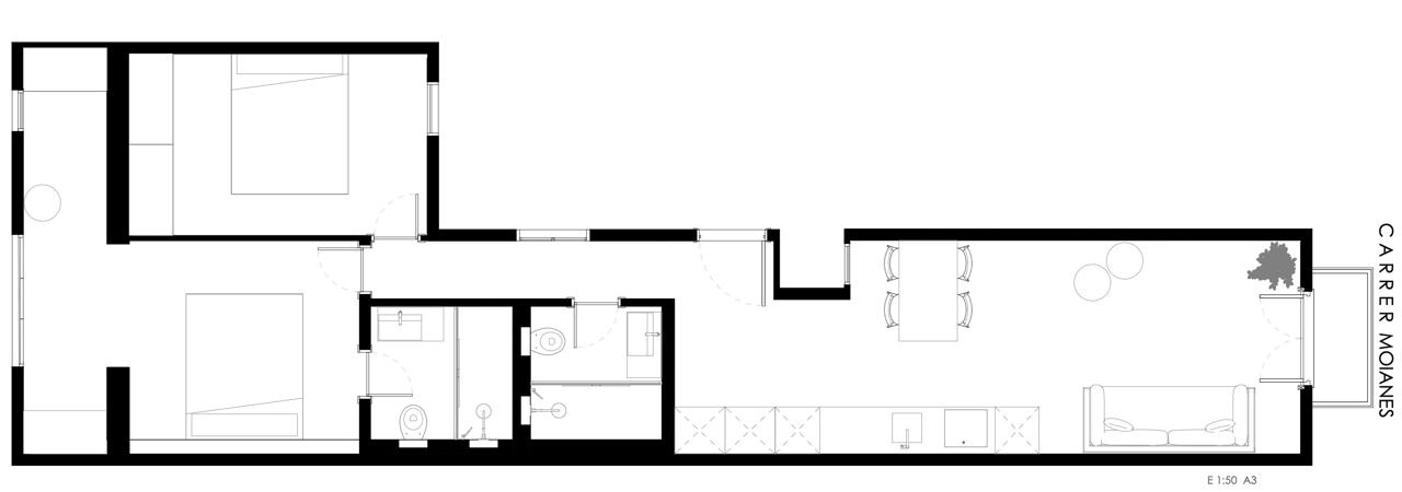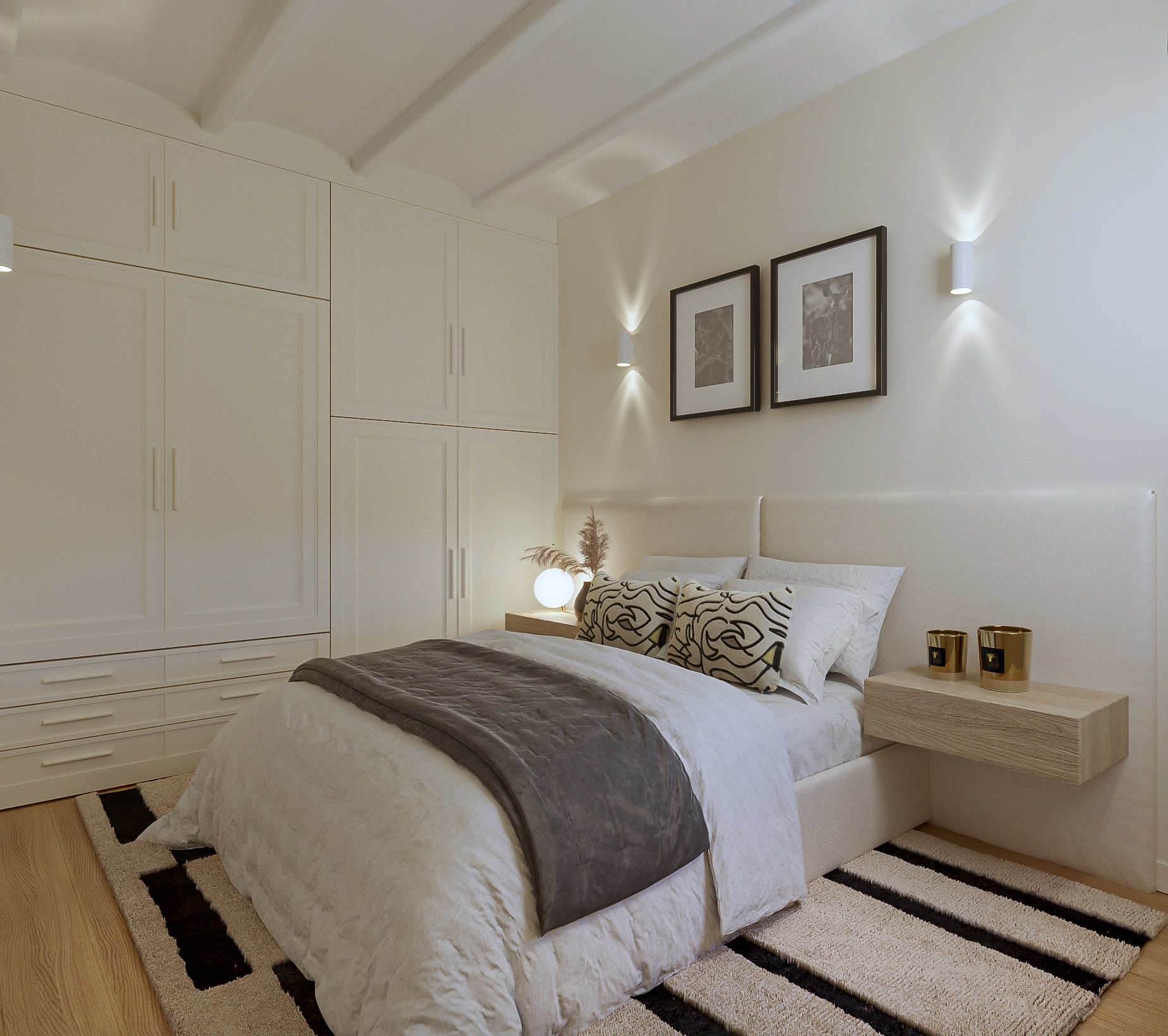The apartment offers 82 sqm of interior space and features a modern open-plan kitchen that connects seamlessly with the living area. Upon entering, the home immediately stands out with its elegant natural oak parquet flooring and beautifully restored Catalan vaulted ceiling, adding character and architectural charm. The living area is filled with natural light throughout the day, creating a warm and inviting atmosphere. The layout includes two comfortable bedrooms and two well-designed bathrooms, offering both privacy and functionality. Additional features include modern climate control, ensuring year-round comfort. The combination of classic architectural elements and contemporary design makes this property both practical and appealing.