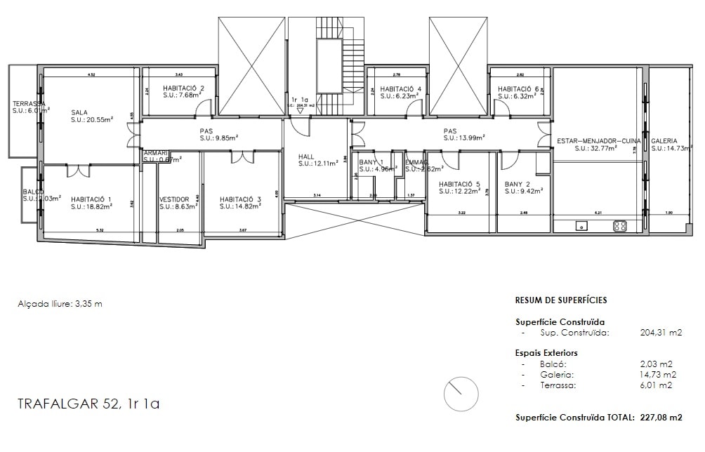 Currently the space consists of an entrance hall, six bedrooms, two bathrooms, an open kitchen room and dining room area, a gallery space and two balconies. The apartment is in great condition, and many of its original modernist elements have been well preserved, such as its characteristic Nolla’s mosaic tile floors, its interior and exterior woodwork and joinery, its windows and also its coiffured ceilings.