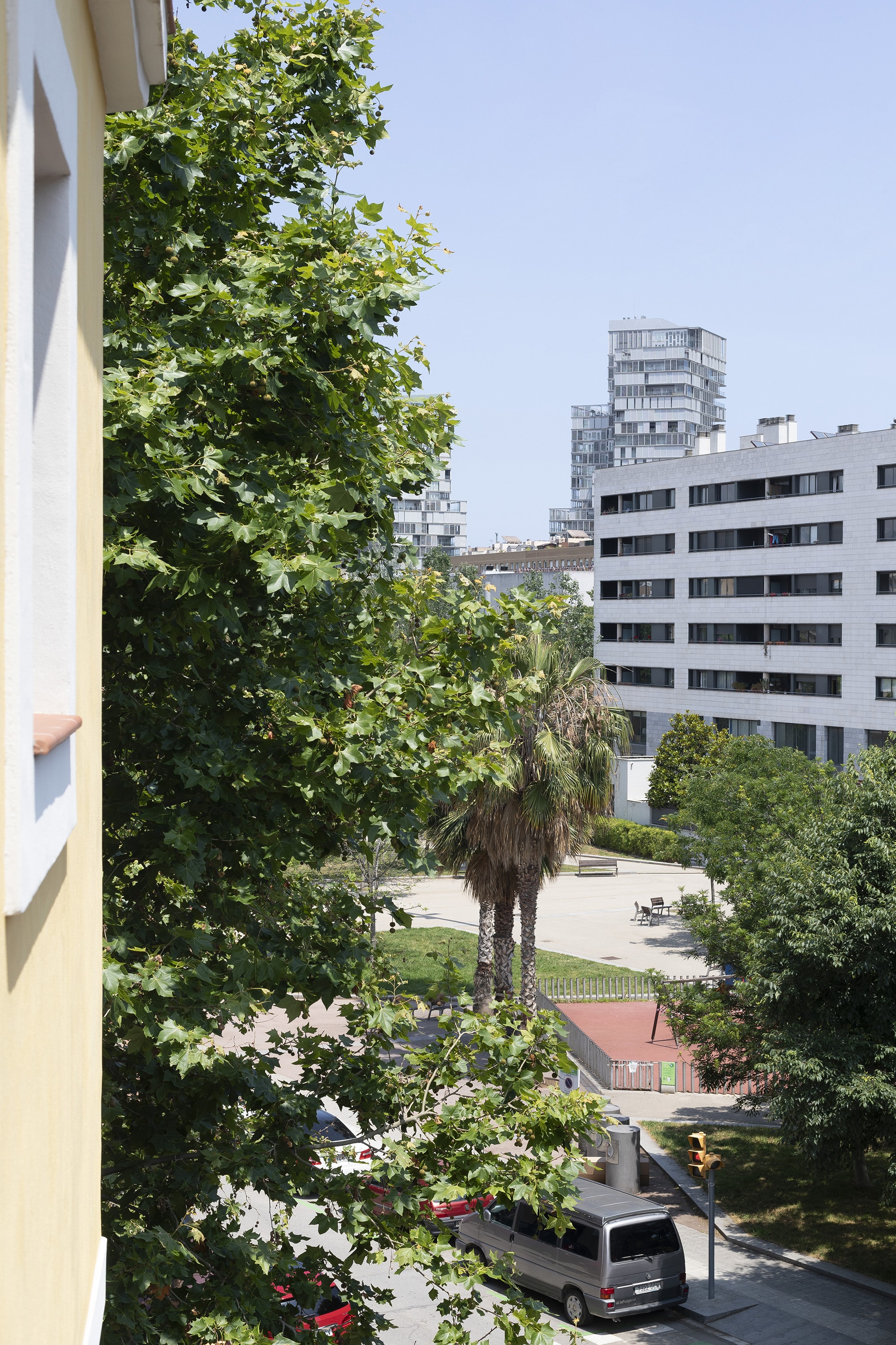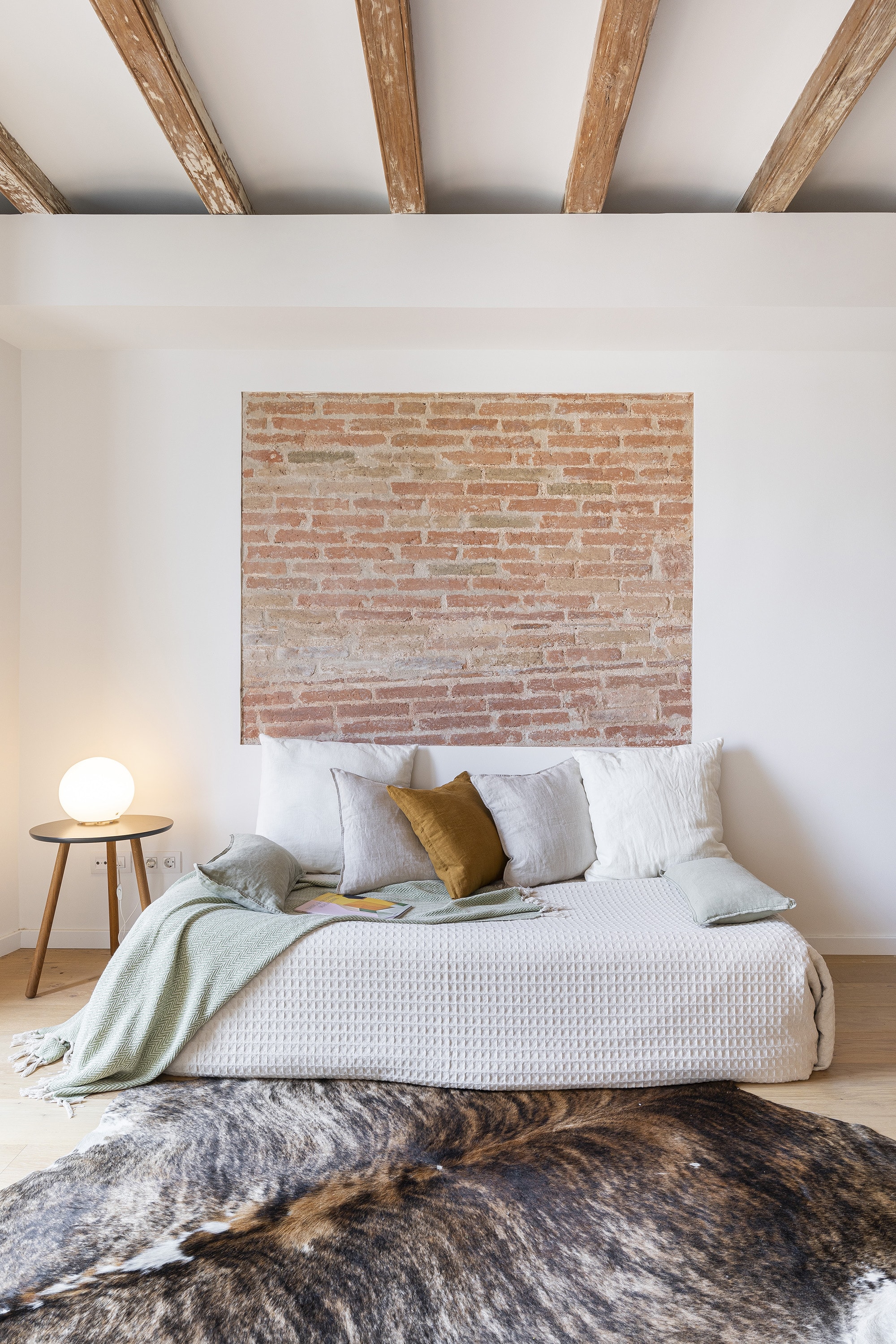 Walk home from the beach to this charming corner building, found on a semi-pedestrian, tree lined street in Poblenou. Our flat underwent a complete renovation that maintained elements of the original style. The exposed brick and authentic ceilings pair beautifully with the oak floor finish to create a cozy feeling. This is the perfect contrast to the modern, efficient elements of the kitchen, windows and air conditioning which make life so easy. The renovation was done to maximize the 64m2 flat's space well. From the open floor plan of the living room one can step out to the balcony which looks onto the quiet street below. The kitchen's structure offers a creative way to separate the living room from the bedrooms, and one can discreetly disappear behind the grey door to the bedrooms behind. There is one single bedroom and one double, both of which have plenty of natural light. From the larger bedroom, one can step out onto a private, small terrace, big enough for a little table and chairs for morning coffee. Since there is access to the outside from both ends of the apartment, the flat feels airy and light.