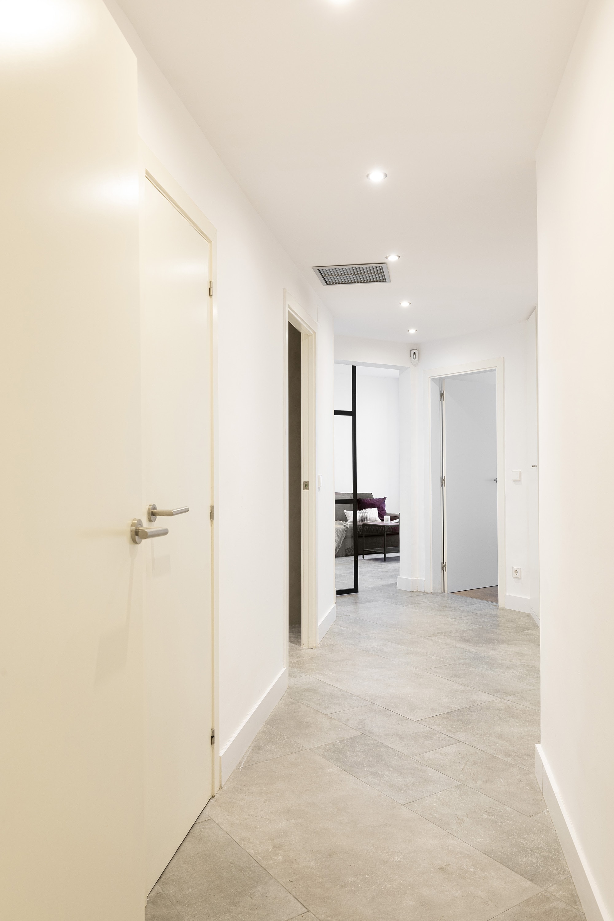 You enter this 98m2 apartment in the hallway, where you find the first single bedroom with a window to the courtyard on your right side. On the left side of the hallway you have a laundry room with the washing machine and the main, large bathroom with a window to the inner courtyard. On your right, you find a double bedroom ensuite with bathroom, both with windows to the inner courtyard and another spacious double bedroom with a large window to the exterior courtyard of the building complex. Both double bedrooms have fitted wardrobes. At the end of the hallway you come into the bright living room and kitchen area, with an American, open kitchen bar and all appliances are included. The living room offers a lot of light, even though it is oriented towards an interior courtyard.